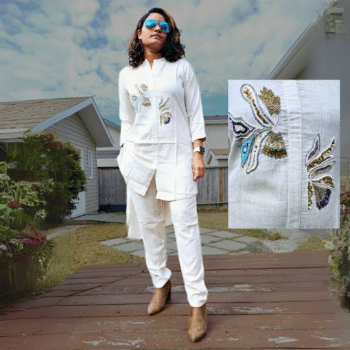 Elevate your everyday style with this elegant off-white co-ord set made from 100% pure khadi fabric. Featuring beautiful front embroidery and a stylish high-low hem—shorter in the front, longer in the back—it’s both modern and timeless. The matching pants include side pockets for comfort and practicality.