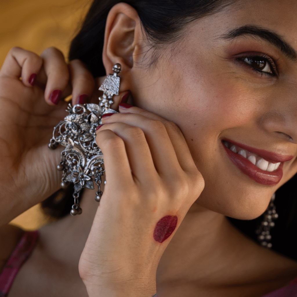 A beautifully crafted oxidized silver plated crescent moon necklace with matching earrings. Vintage finish, lightweight design, perfect for everyday or festive wear.