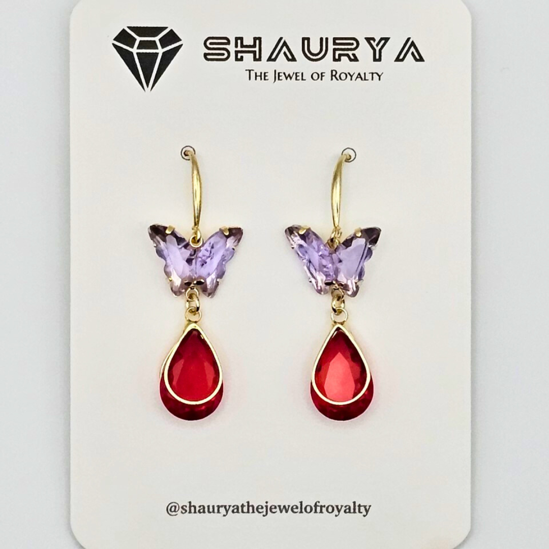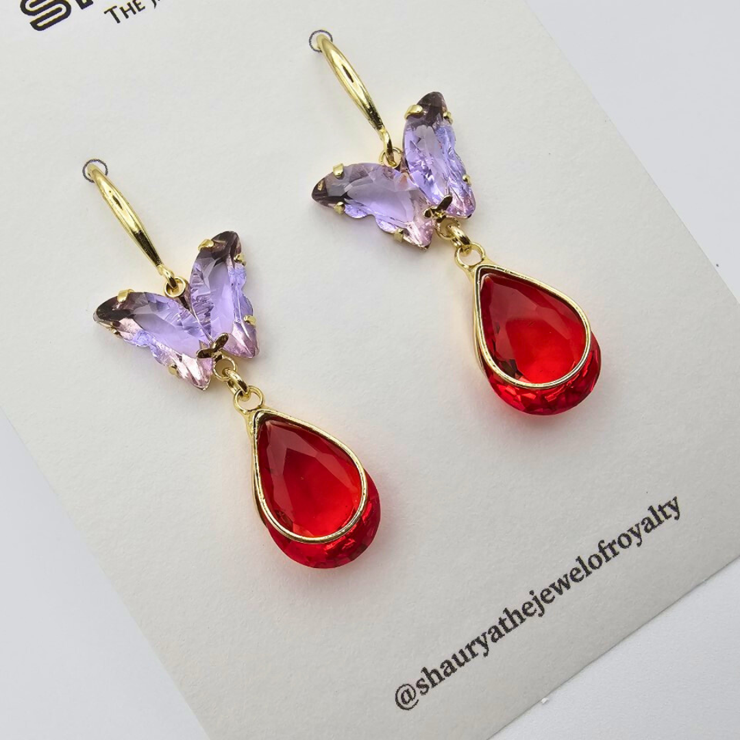 Butterfly & Red Drop Diamond Statement Earrings with Gold Plating