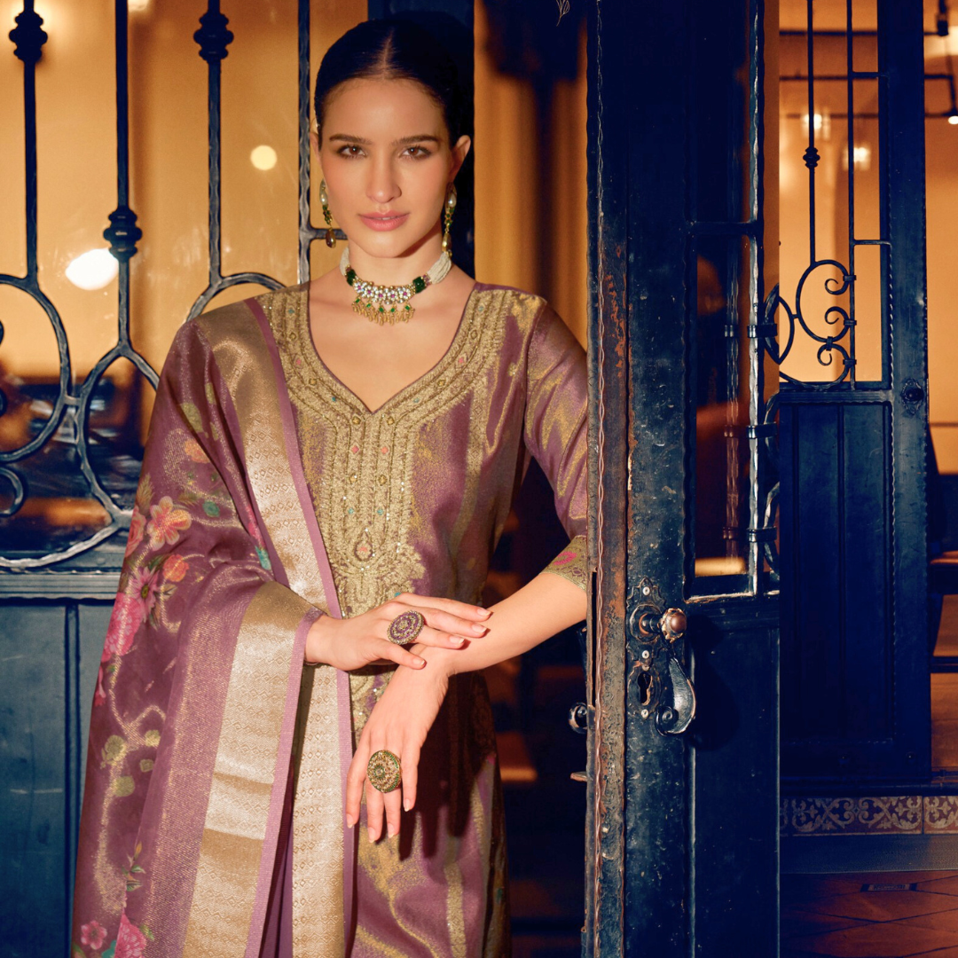 Banarasi Jacquard Silk Salwar Kameez in Dark Mauve with Gold Embroidery