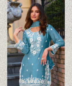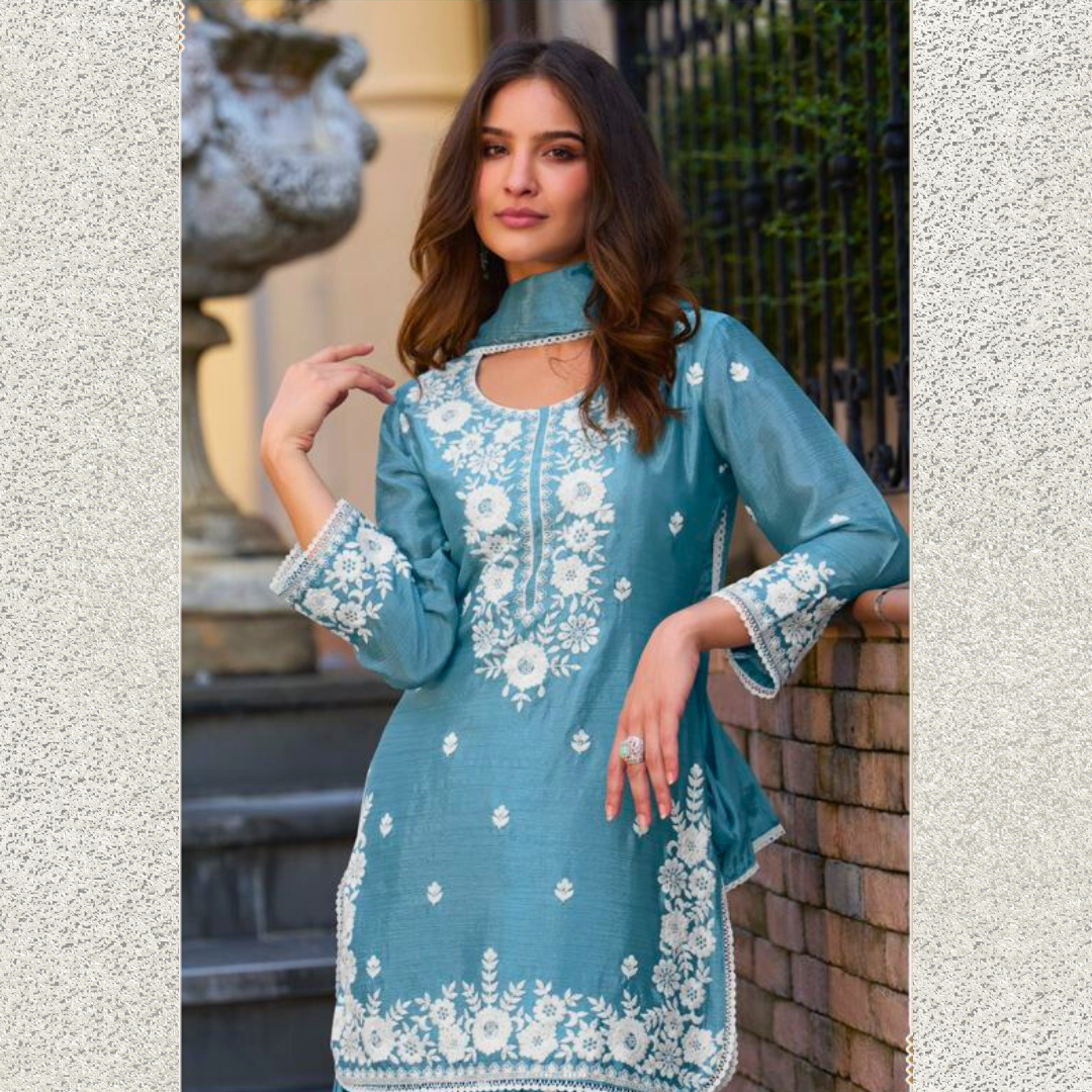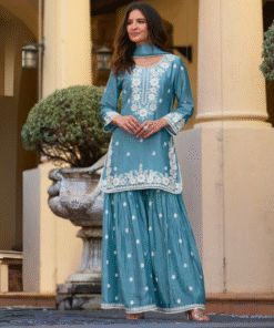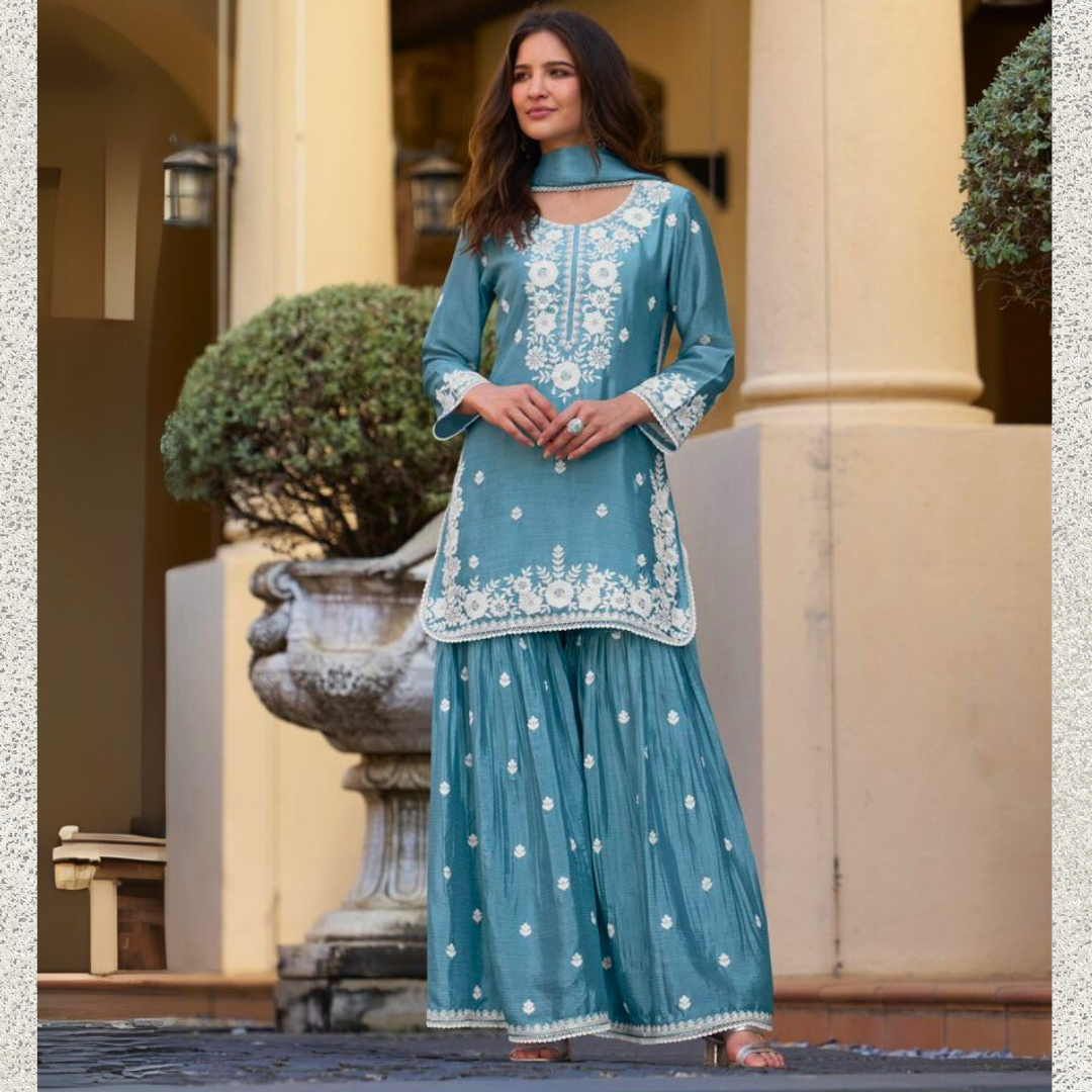 Dusk Blue Chinon Sharara Suit Set with White Embroidery