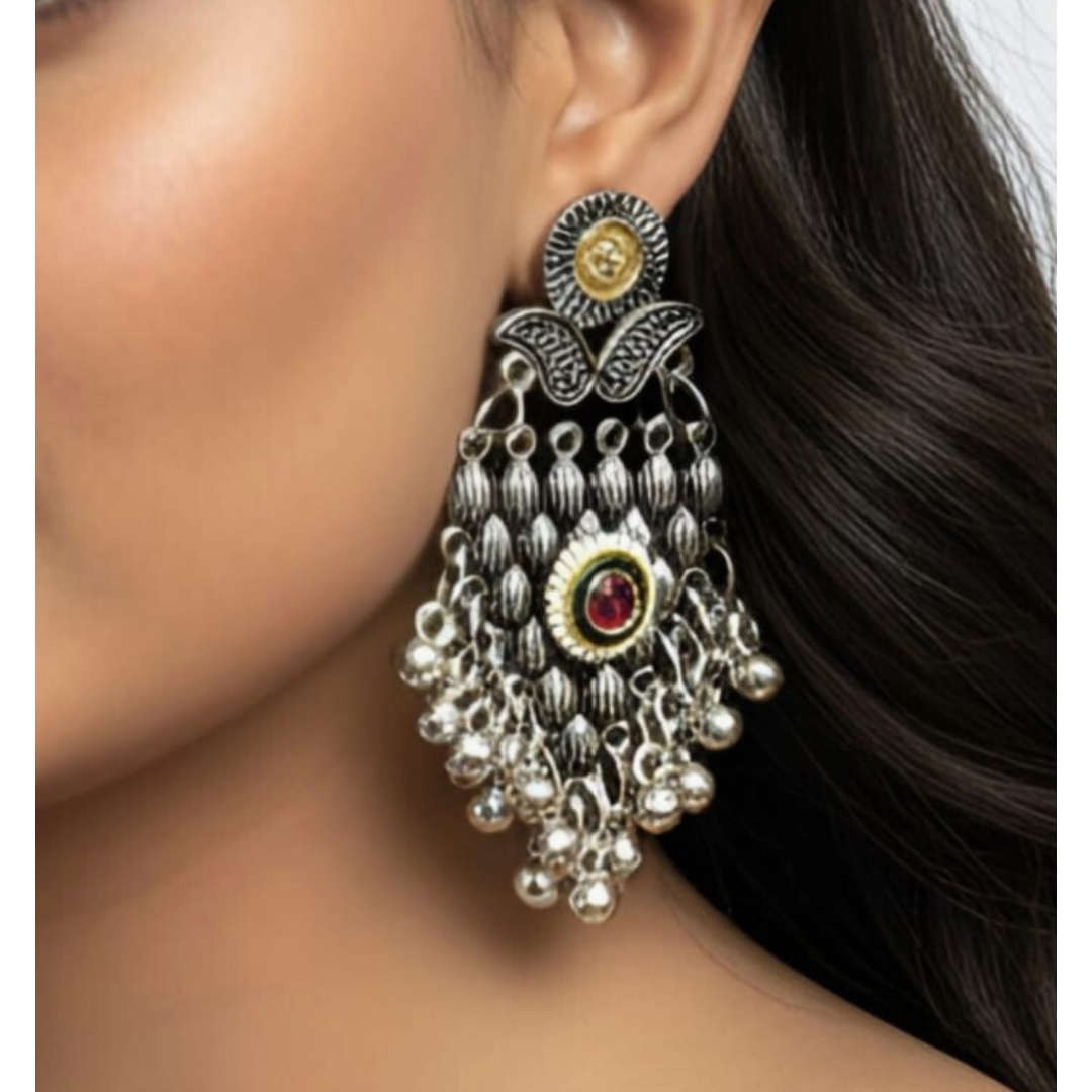 Traditional dual-tone oxidized silver jhumka earrings with a central red stone and small dangling beads. Perfect for festive, party, or ethnic wear.