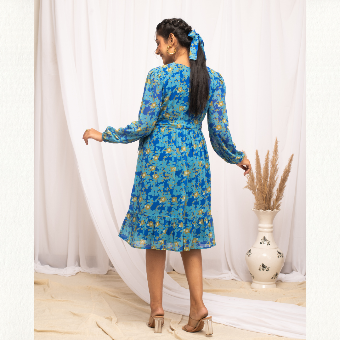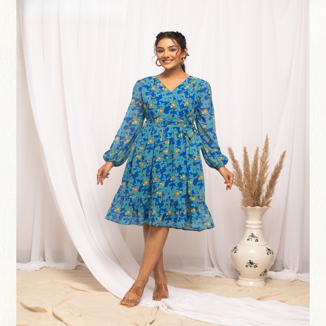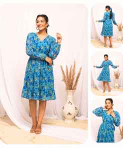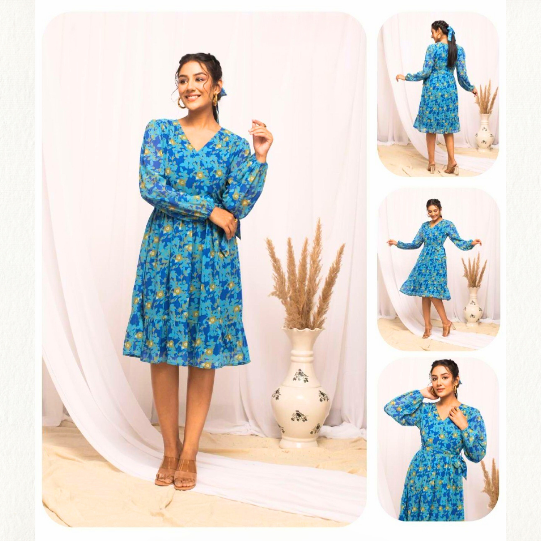 💙 Add a fresh, feminine touch to your wardrobe with this elegant light blue western dress, featuring delicate blue floral prints. Crafted from lightweight georgette fabric with a soft crepe lining, it offers breathable comfort and a flattering fit.