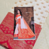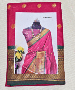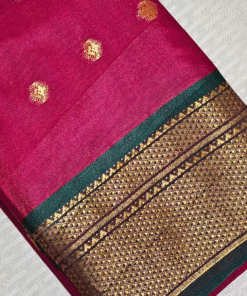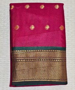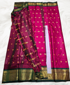The smooth silk drape, intricate pallu design, and vibrant colors make it a statement piece for any wardrobe. Pair it with a classic golden blouse or a contrasting green one to complete your radiant festive look.