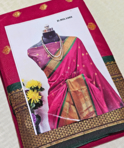 The smooth silk drape, intricate pallu design, and vibrant colors make it a statement piece for any wardrobe. Pair it with a classic golden blouse or a contrasting green one to complete your radiant festive look.
