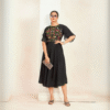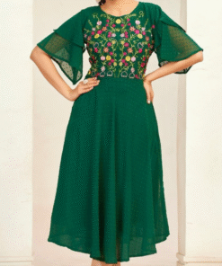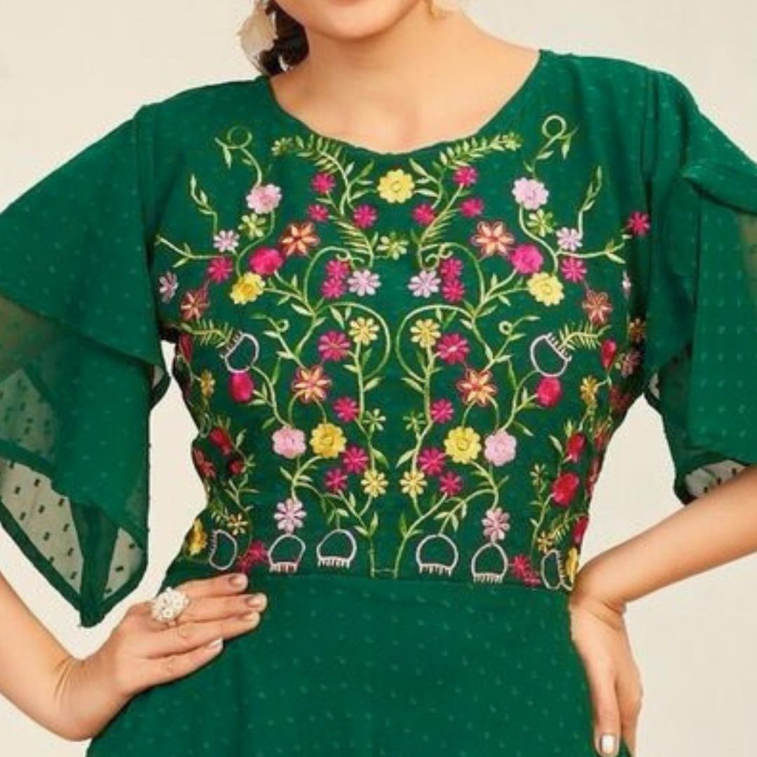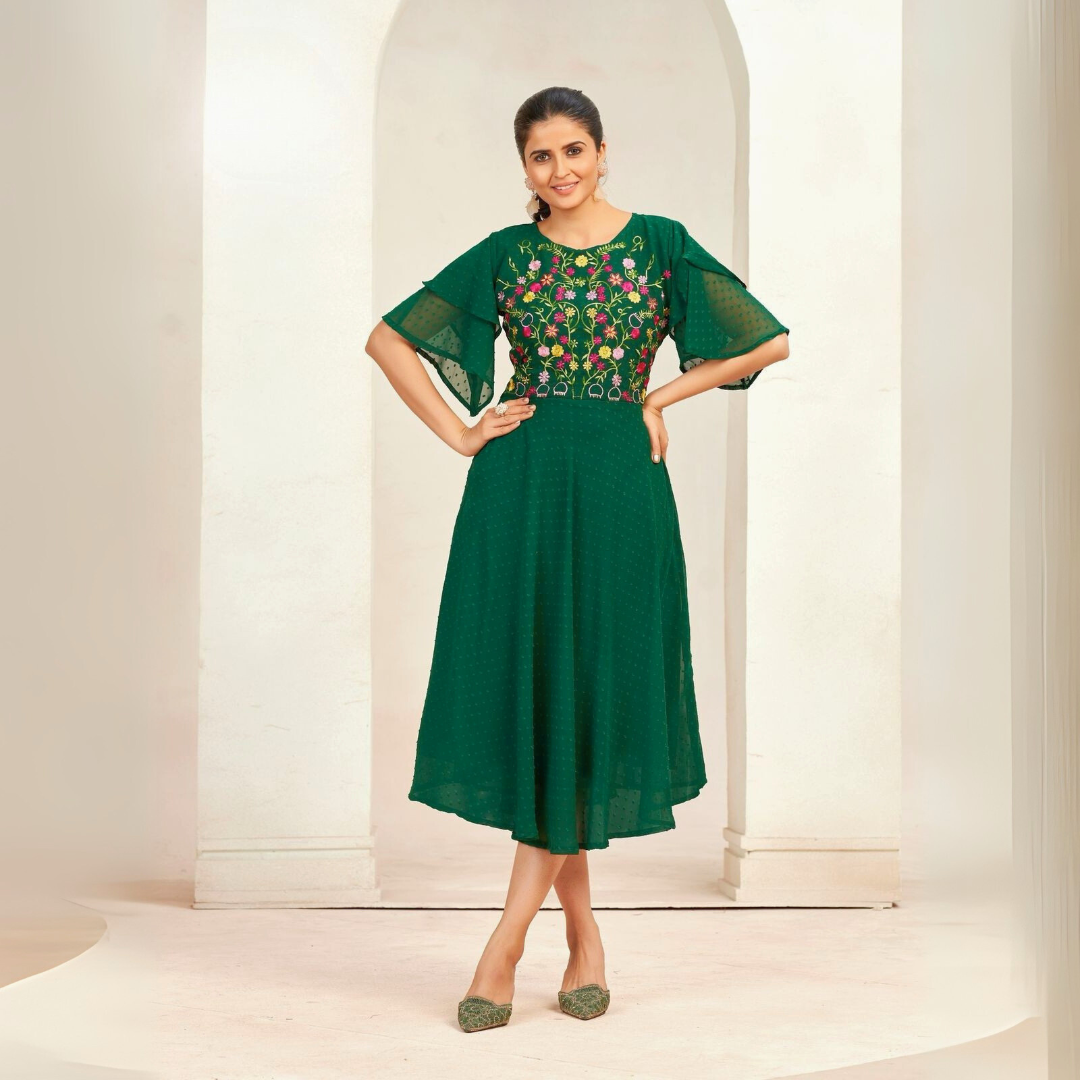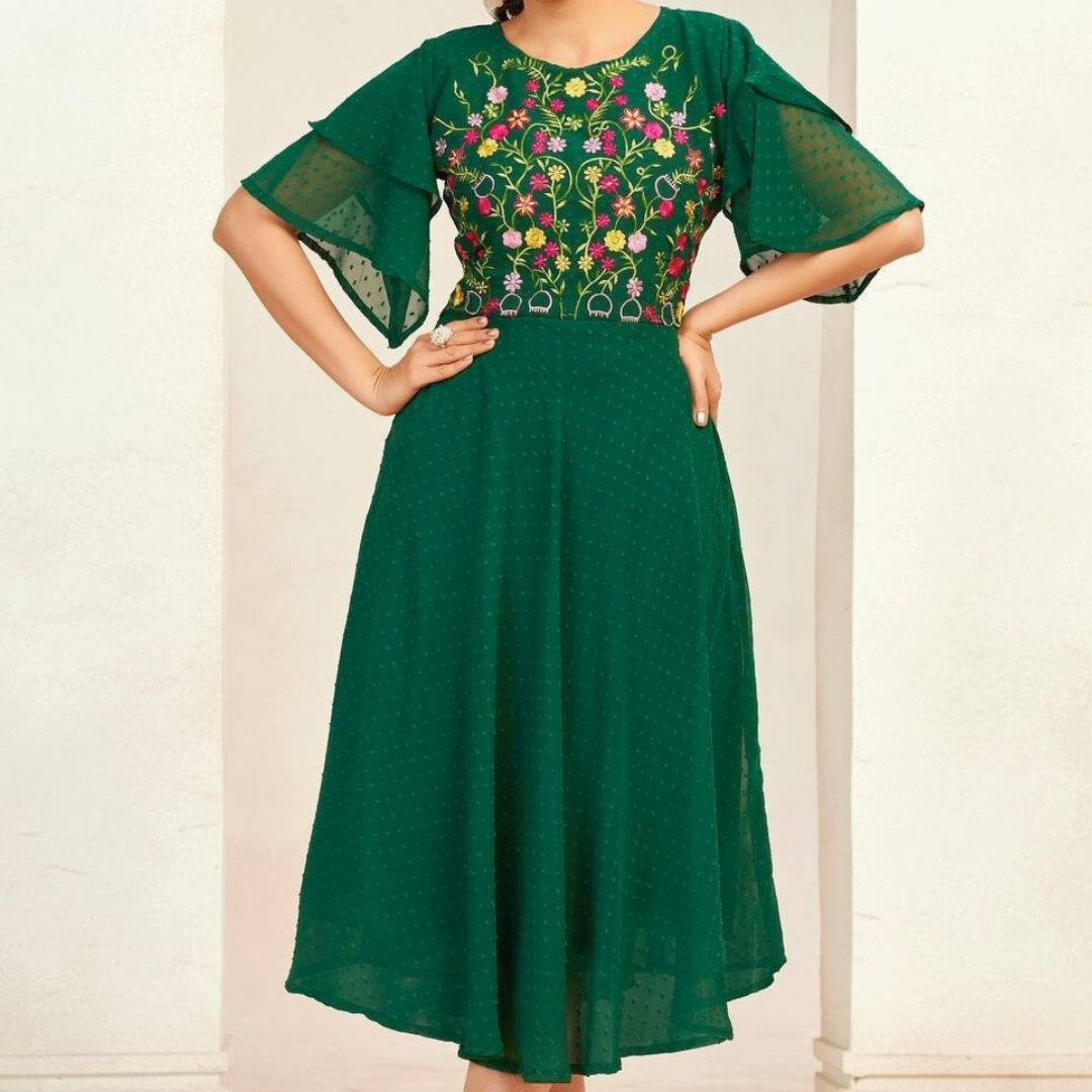 Flared Georgette Dress with Elegant Floral Embroidery – GREEN