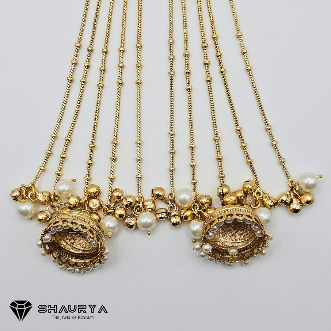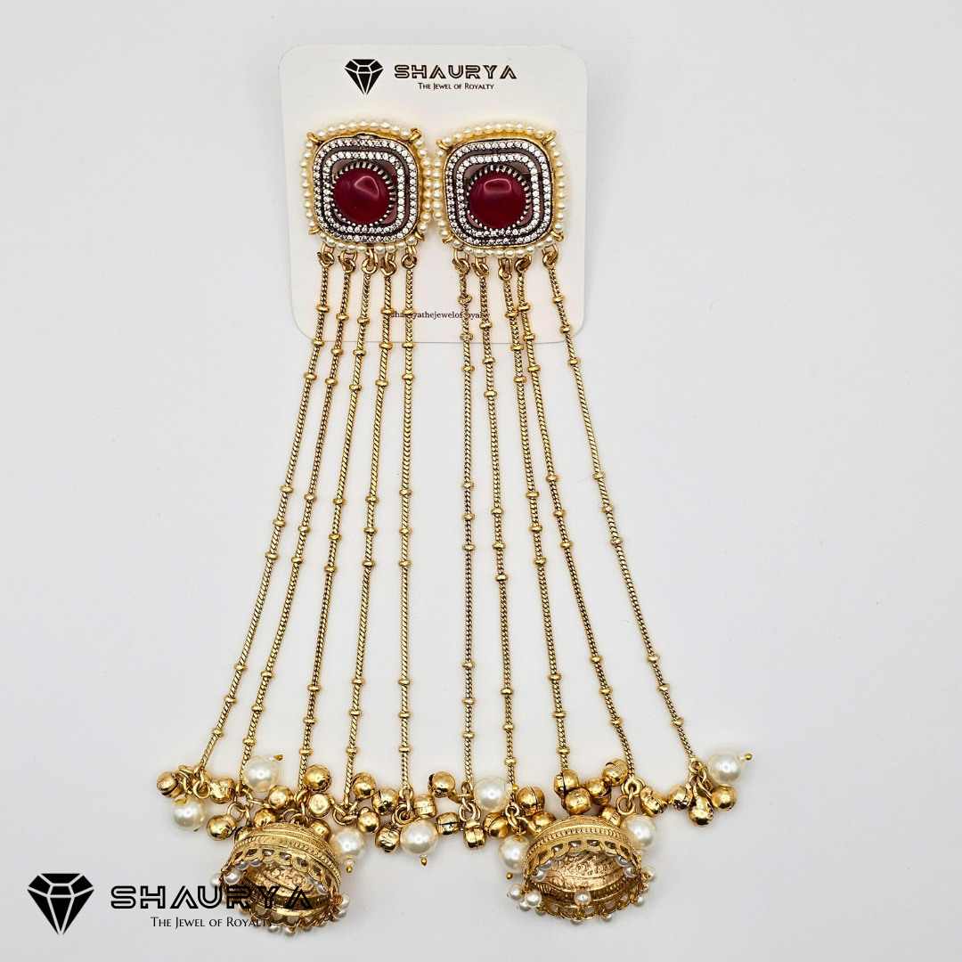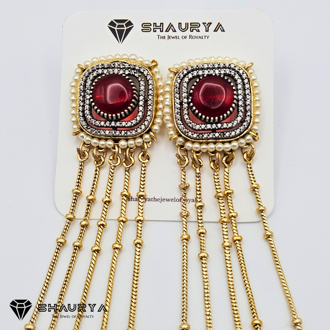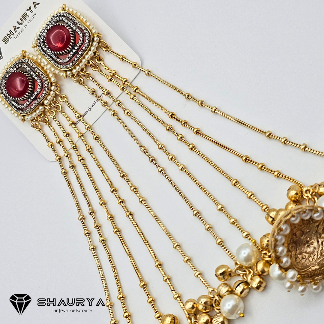 Elegant gold-finish Kashmiri earrings crafted in brass with moissanite, red stones, and pearl detailing—perfect for festive and wedding wear.