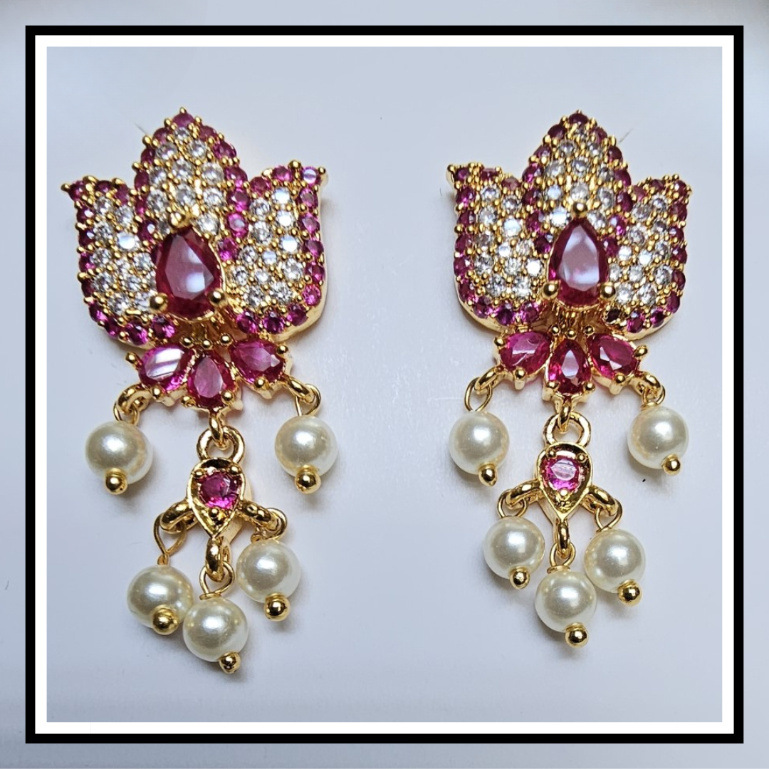 Graceful and timeless, these Lotus Design Polki Earrings are a celebration of traditional artistry and elegance. Crafted with intricate lotus motifs, these earrings are embellished with shimmering Polki stones, radiant red accents, and finished with delicate pearl danglings that add movement and charm.