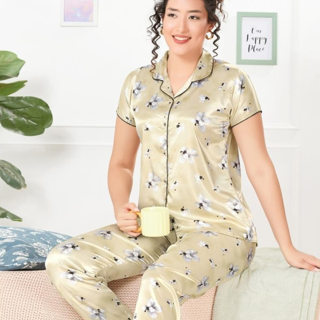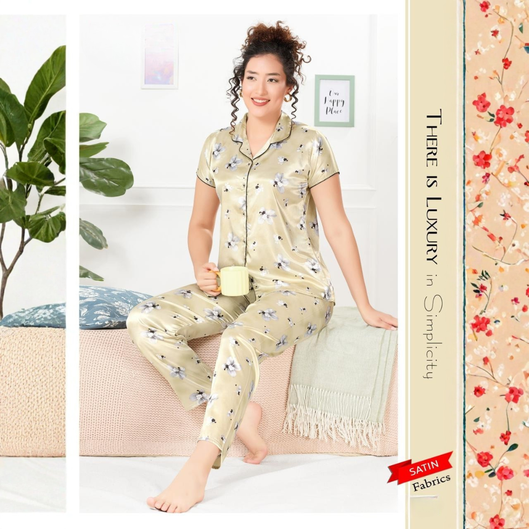 Luxurious 2-piece satin night suit featuring a soft, silky finish and relaxed fit for elegant comfort and restful sleep.