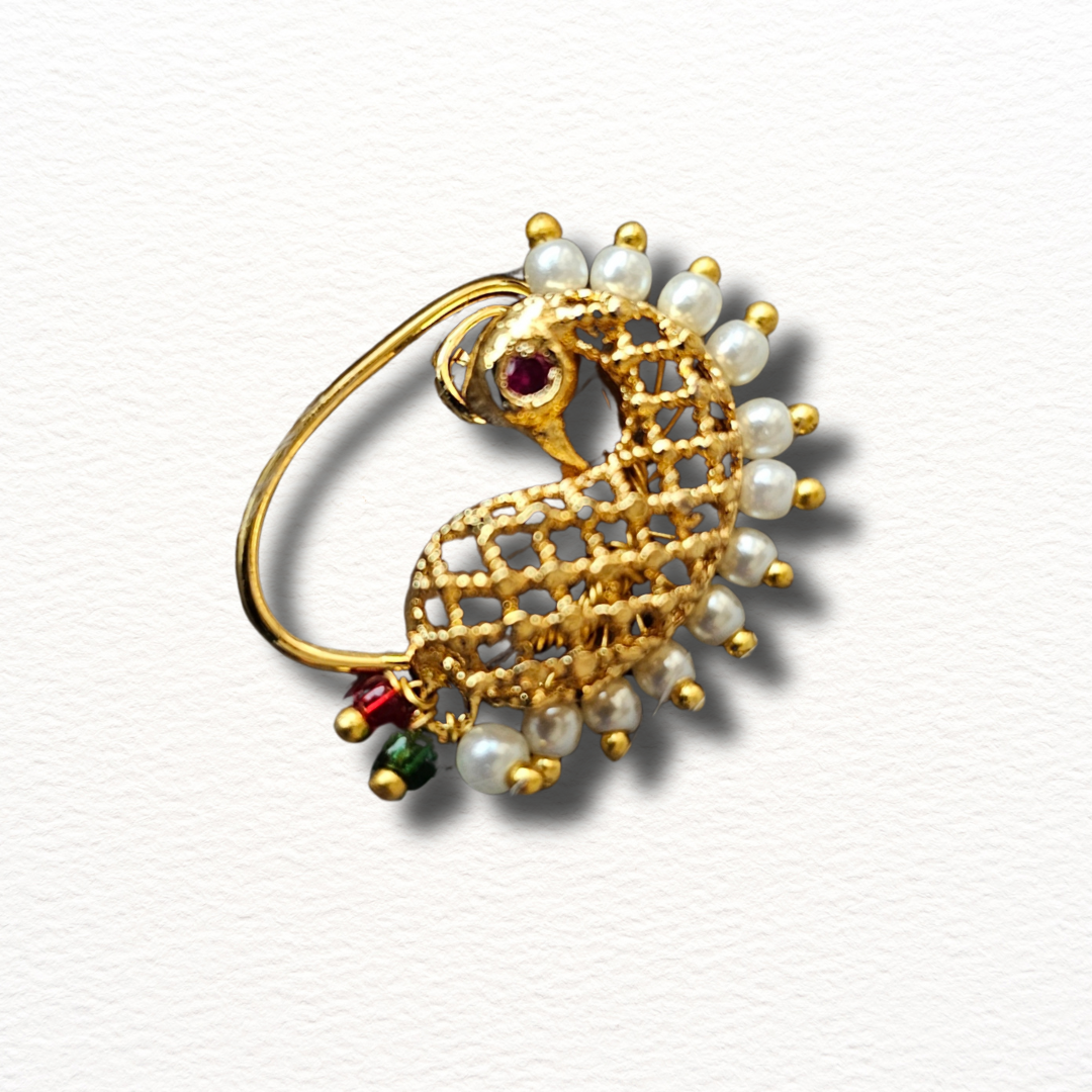 This timeless handmade Maharashtrian Nath (2.7 cm) features a peacock-shaped cross net, non-pierced clip-on design for maximum comfort. Adorned with a striking red stone and a beautiful white Moti outline, it suits both women and girls. Crafted with anti-tarnish material to retain shine. Non-returnable due to hygiene reasons. A graceful, ethnic essential for festive elegance.