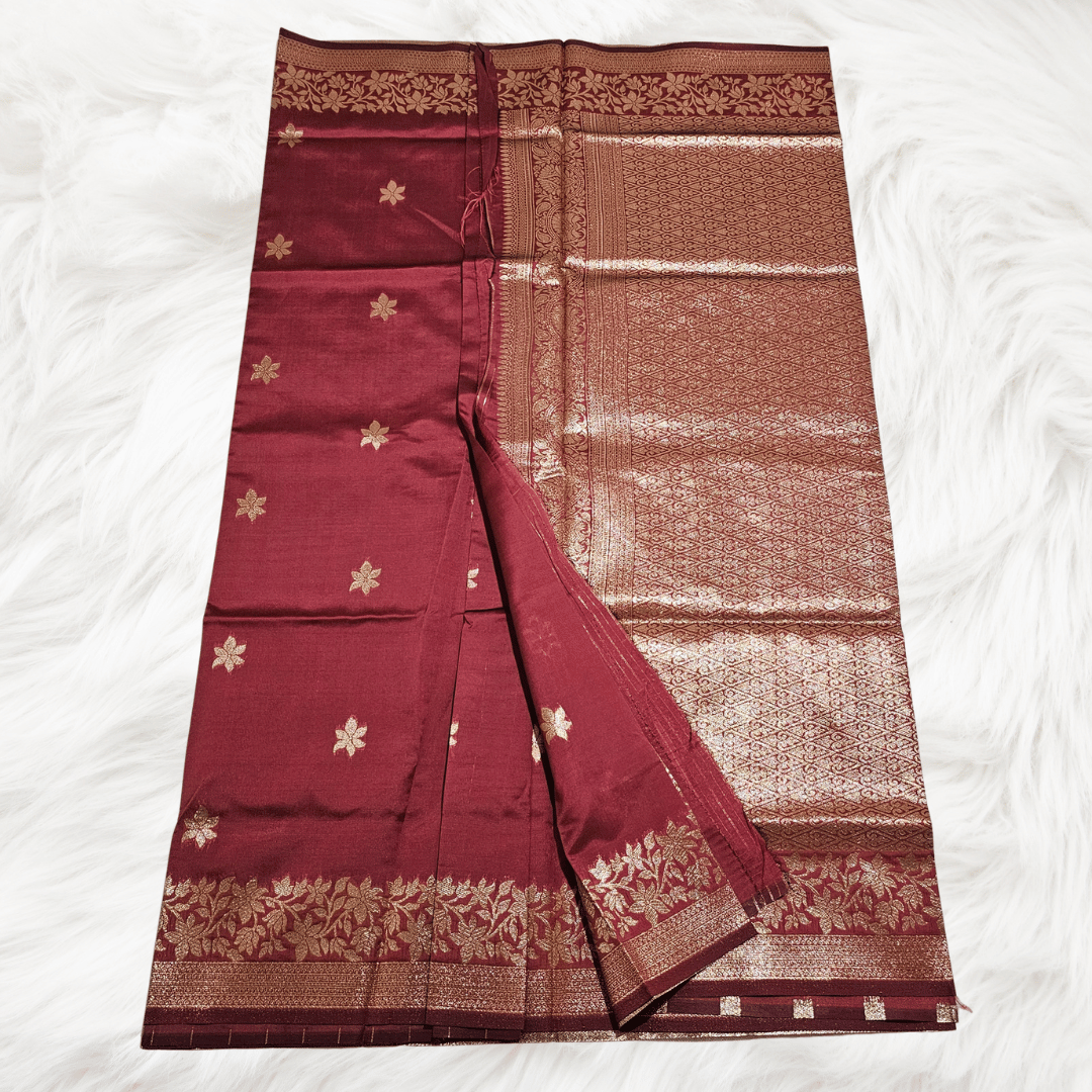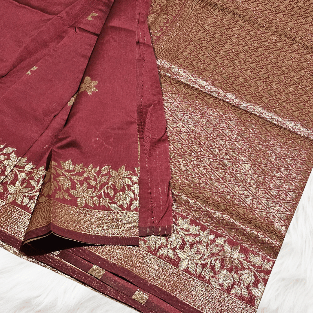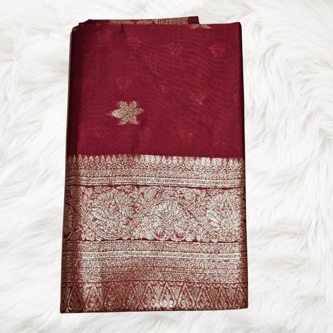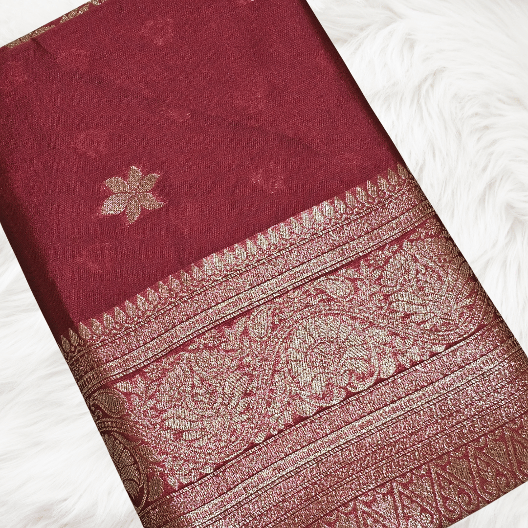 Experience timeless elegance with this Maroon Roman Silk Saree, designed to bring out regal charm and sophistication. Crafted from premium Roman silk, the saree features a subtle metallic sheen that enhances its rich maroon hue, making it perfect for festive and special occasions.