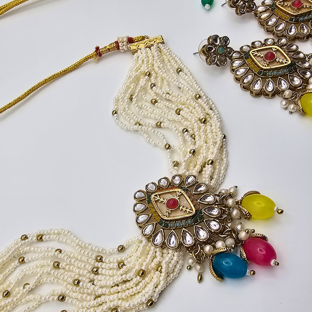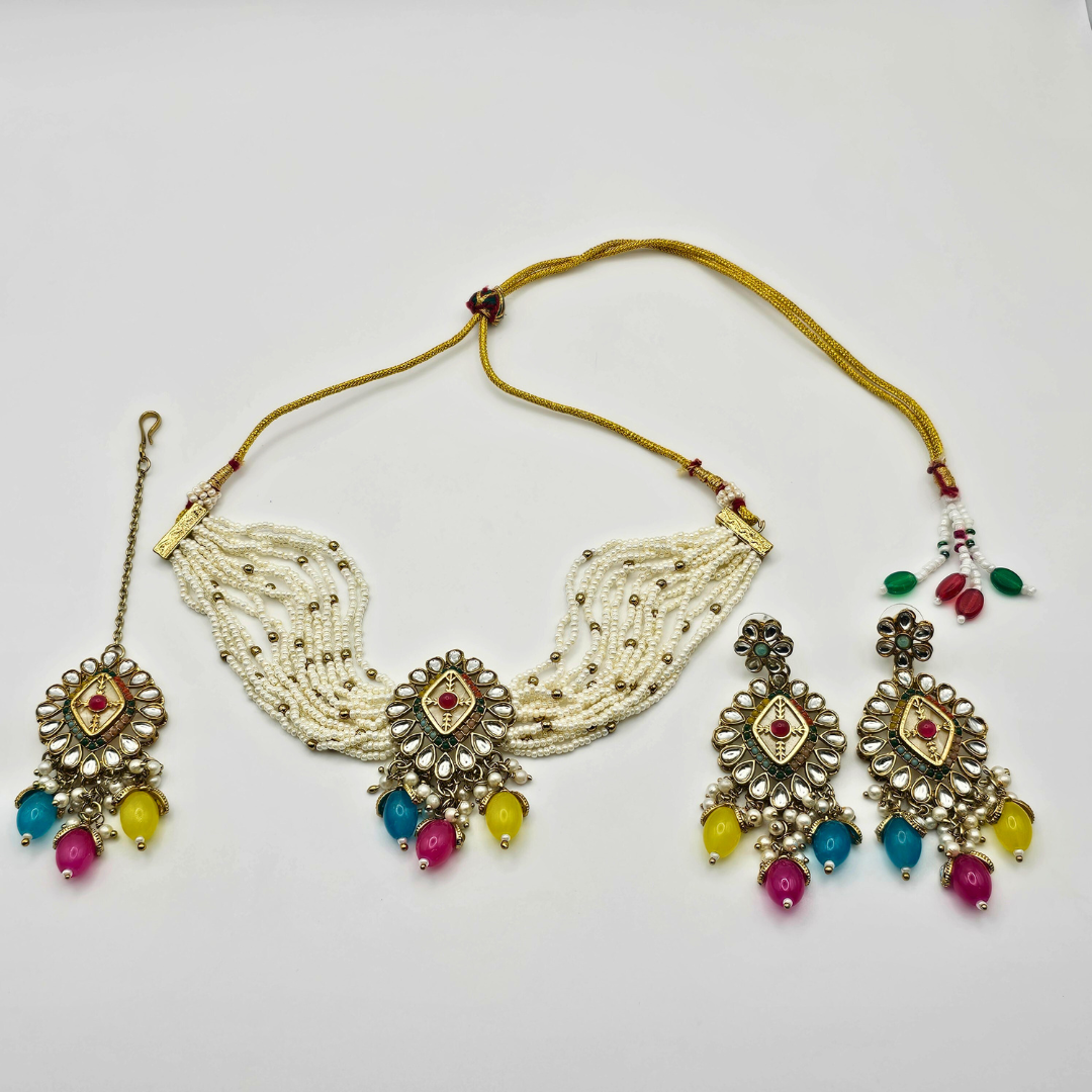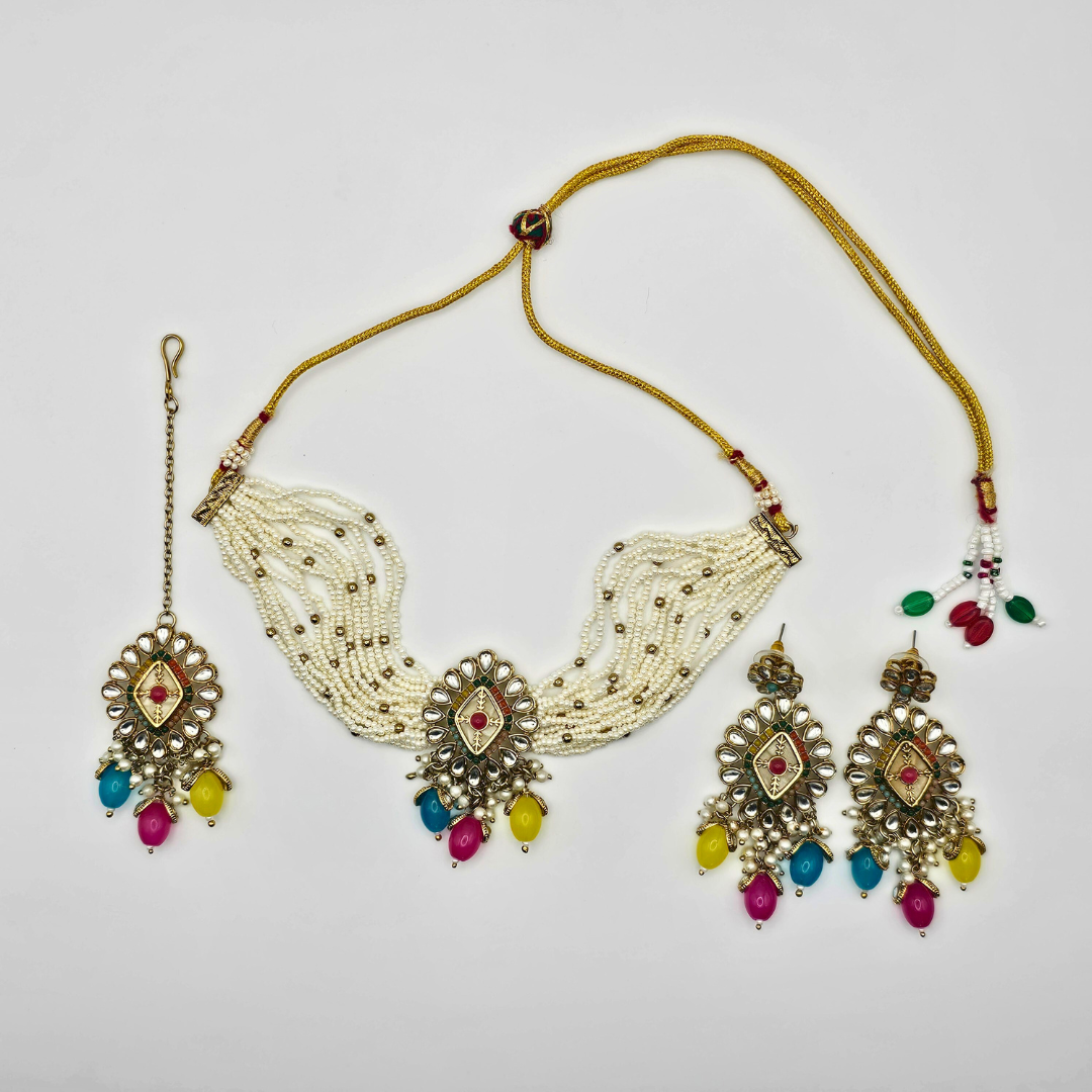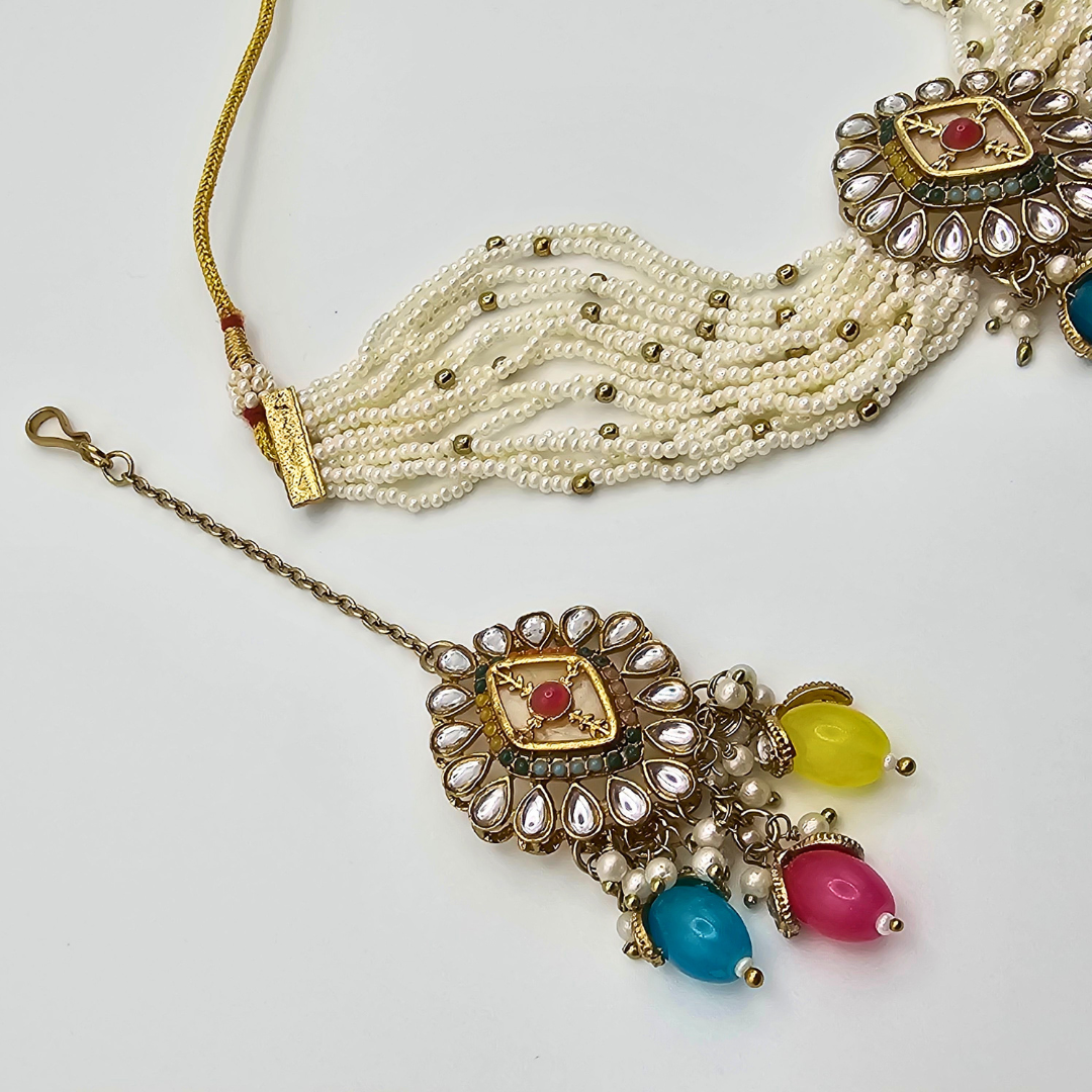 Stunning multicolor Kundan choker necklace with matching earrings and maang tikka. Crafted with white beads and colorful drop accents—perfect for bridal and festive looks.