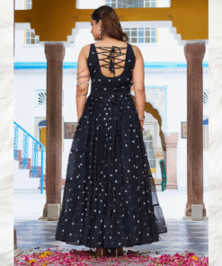 A festive black & red embroidered long gown designed for Navratri. Sleeveless, elegant, and comfortable—perfect for Garba nights and traditional celebrations.