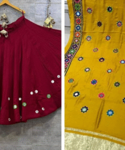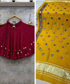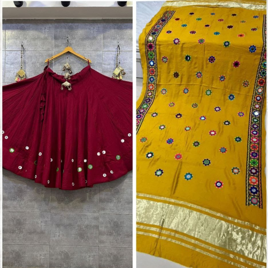 Maroon lehenga with mustard dupatta, freesize, comes with blouse piece. Perfect for Navratri & Garba nights. Pair with HERAURA blouses for added elegance.