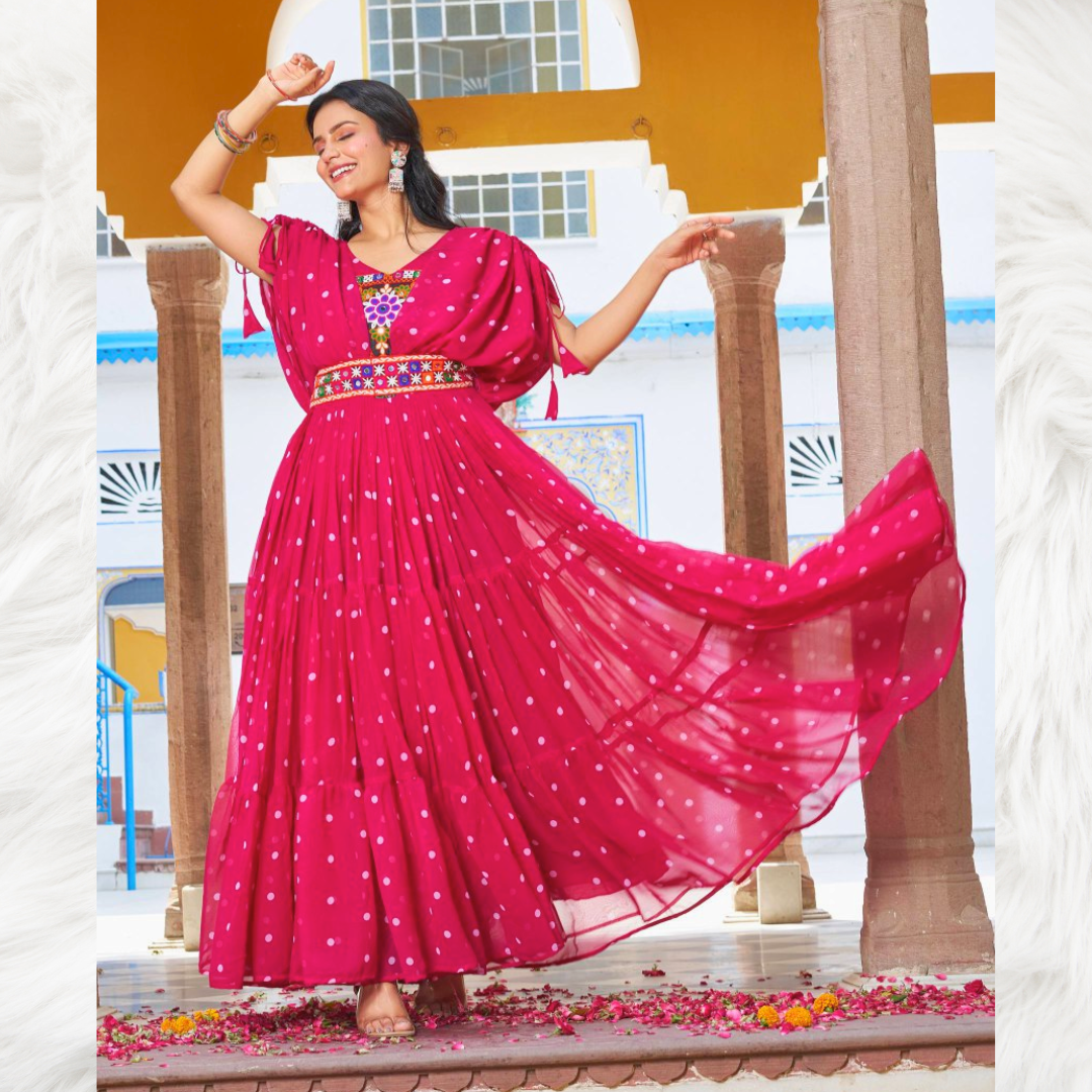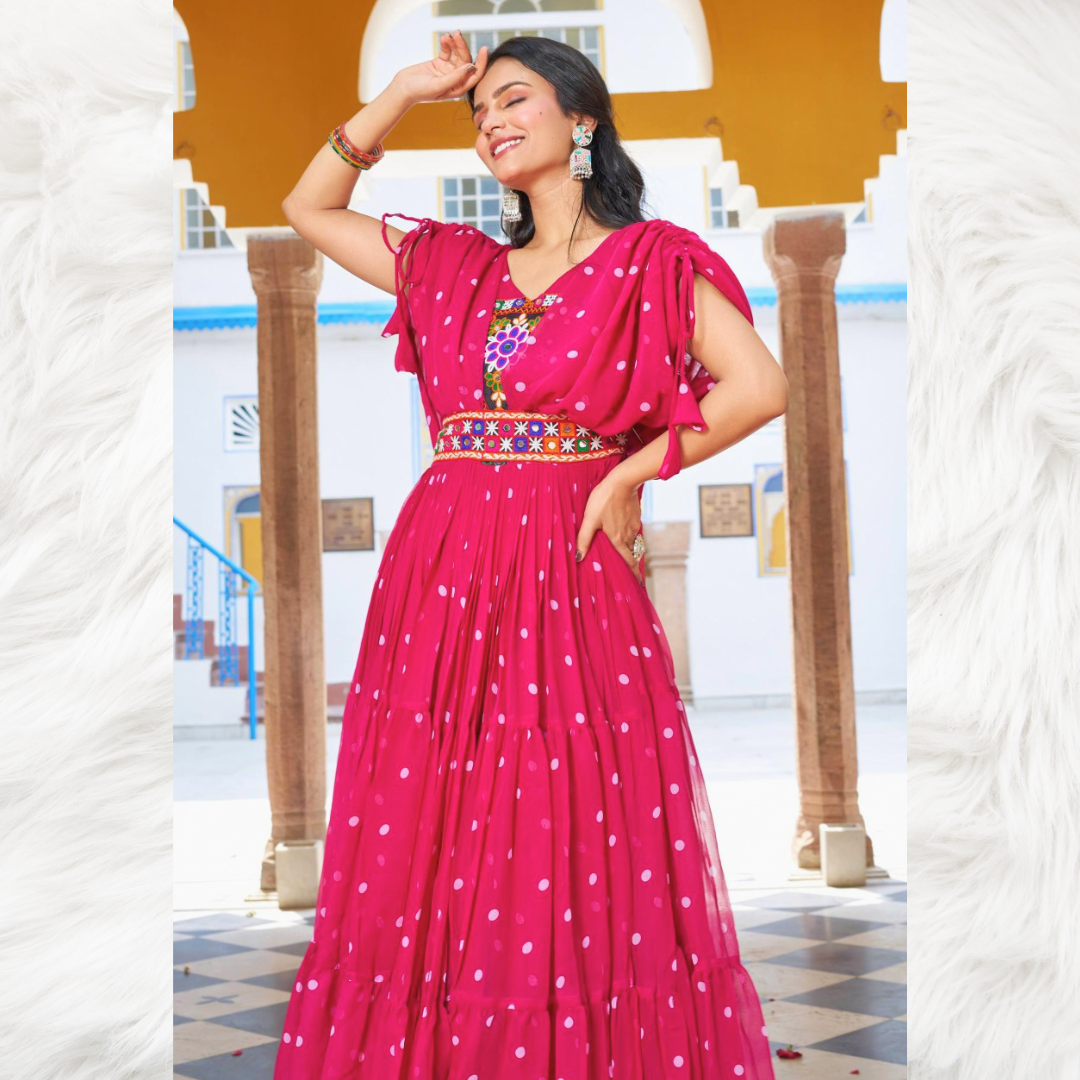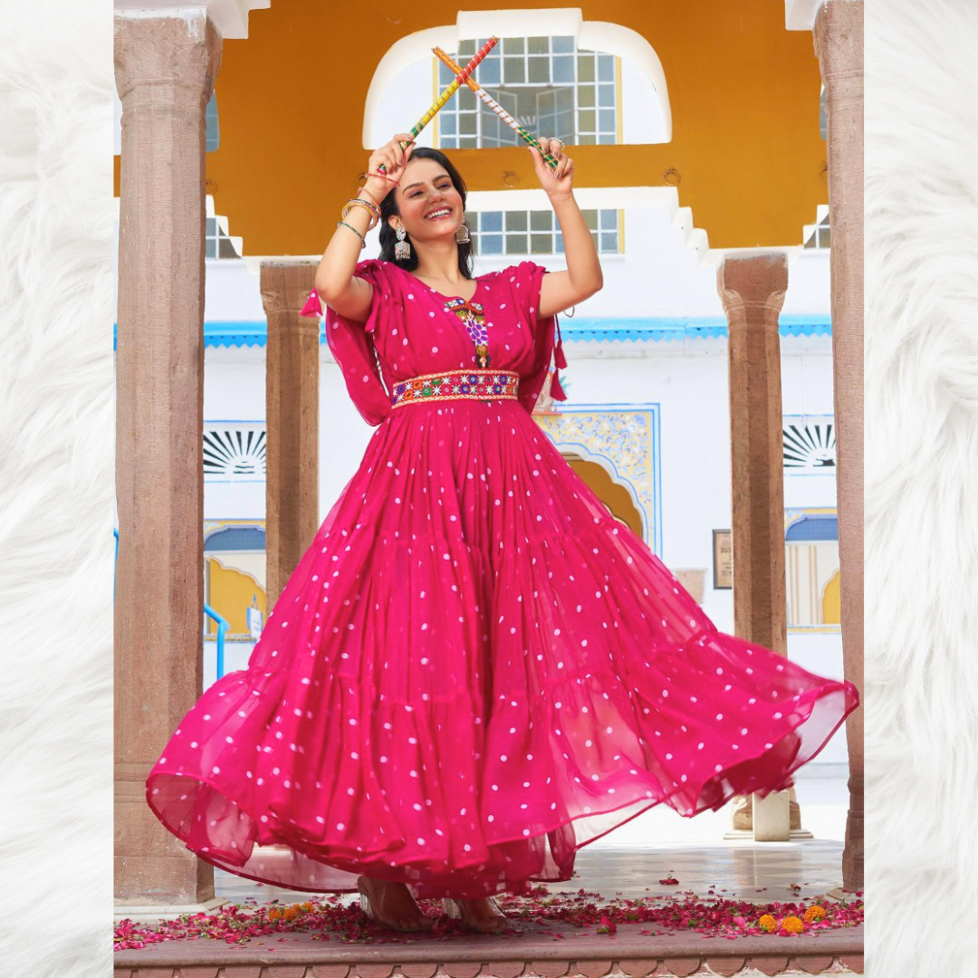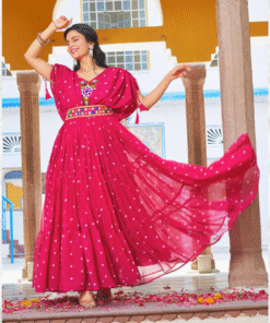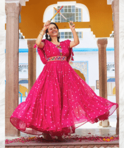 A stunning pink long gown with front embroidery and knot-detailed sleeves, perfect for Navratri celebrations and festive evenings.