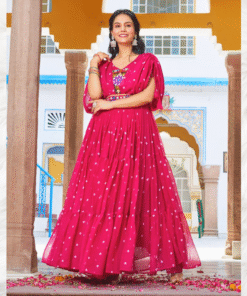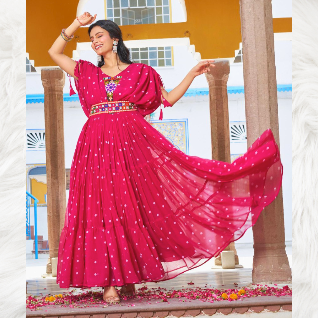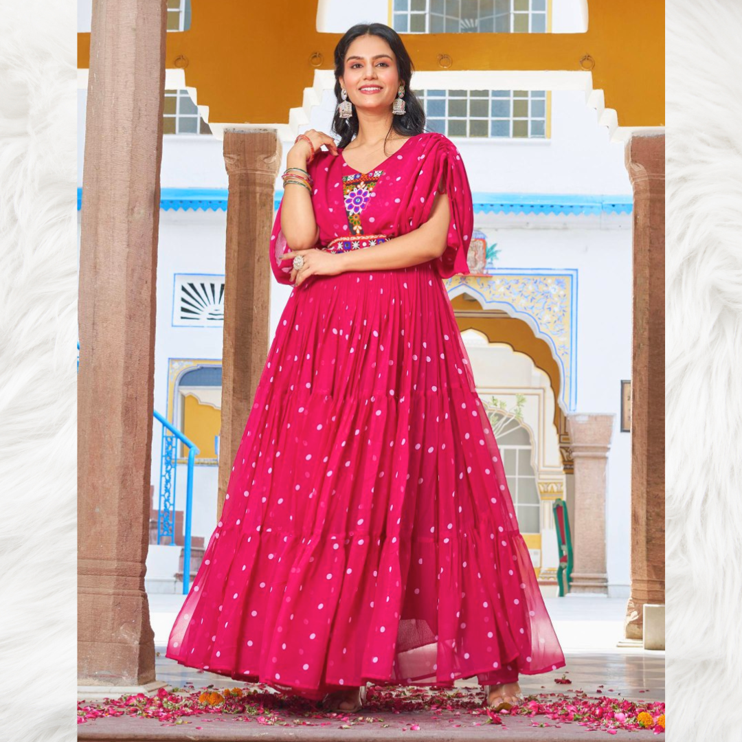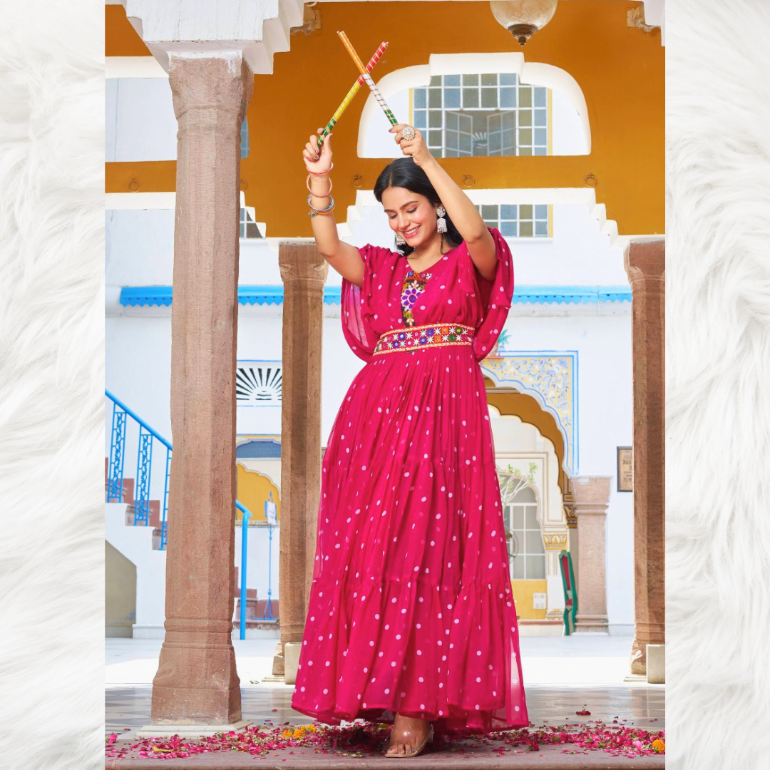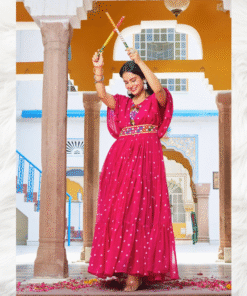 A stunning pink long gown with front embroidery and knot-detailed sleeves, perfect for Navratri celebrations and festive evenings.