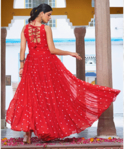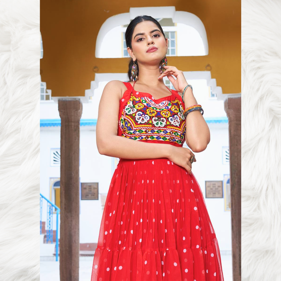 Perfectly tailored for movement and grace, this gown lets you shine effortlessly while staying comfortable throughout the festivities. Pair it with statement jewelry for a royal look, or keep it minimal for subtle elegance — either way, you’ll be the center of attention this Navratri.