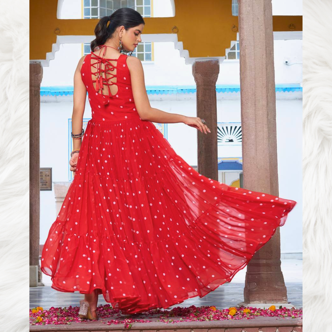 Celebrate the spirit of Navratri in timeless elegance with our Navratri Special Red Embroidered Long Gown. Designed to blend tradition with modern flair, this gown is crafted in a vibrant festive red, symbolizing energy and grace. The beautifully detailed front embroidery adds a touch of sophistication, while the sleeveless design ensures comfort and style for long hours of garba and dandiya nights.