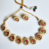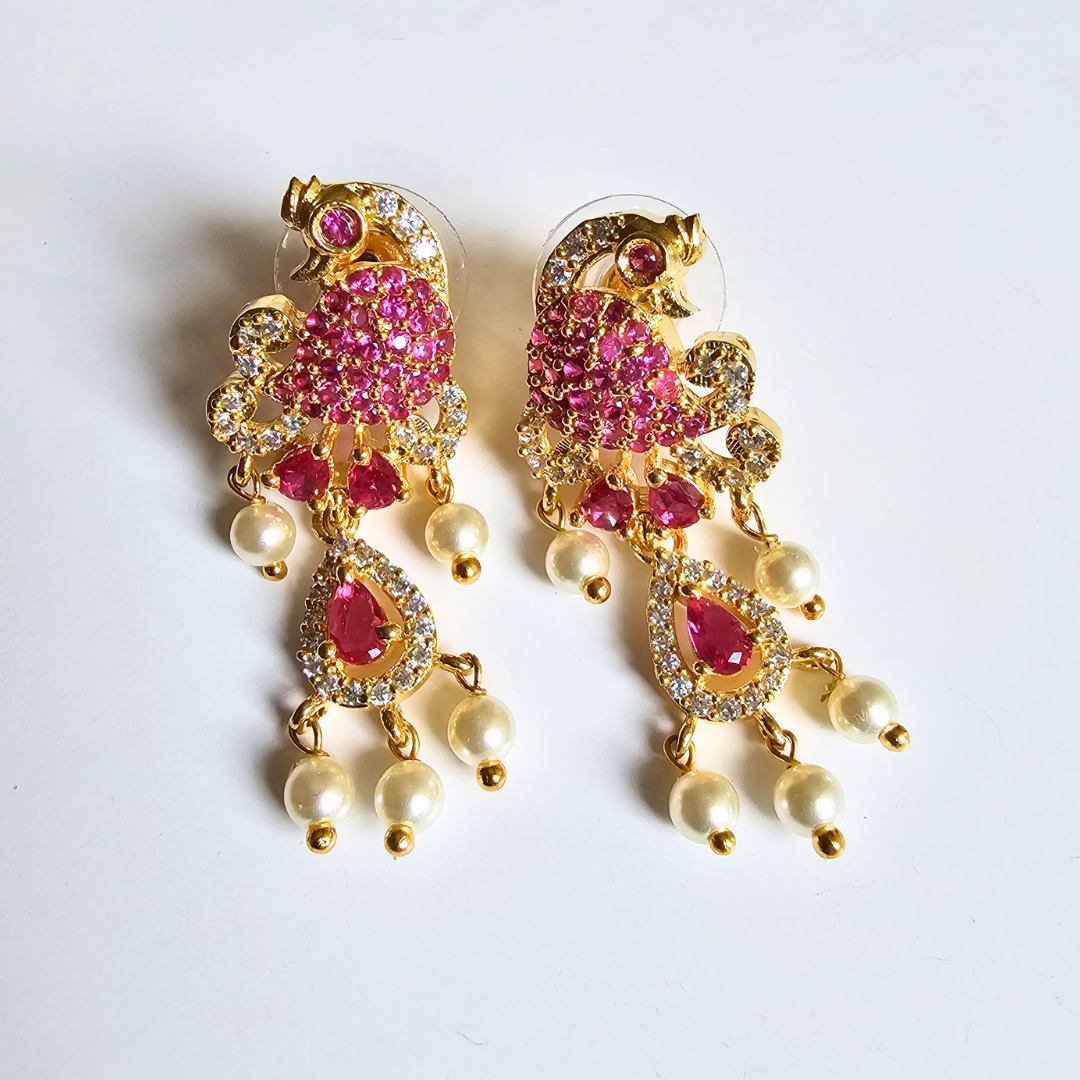 The lustrous pearls are paired with intricate gold accents, finished with a beautiful touch of soft pink stones for a hint of color and elegance. The set includes a pair of matching earrings, completing your look with timeless harmony—perfect for weddings, festivals, or special evenings.