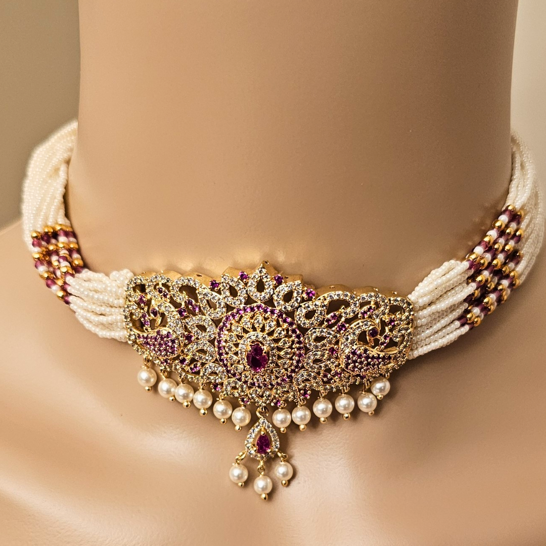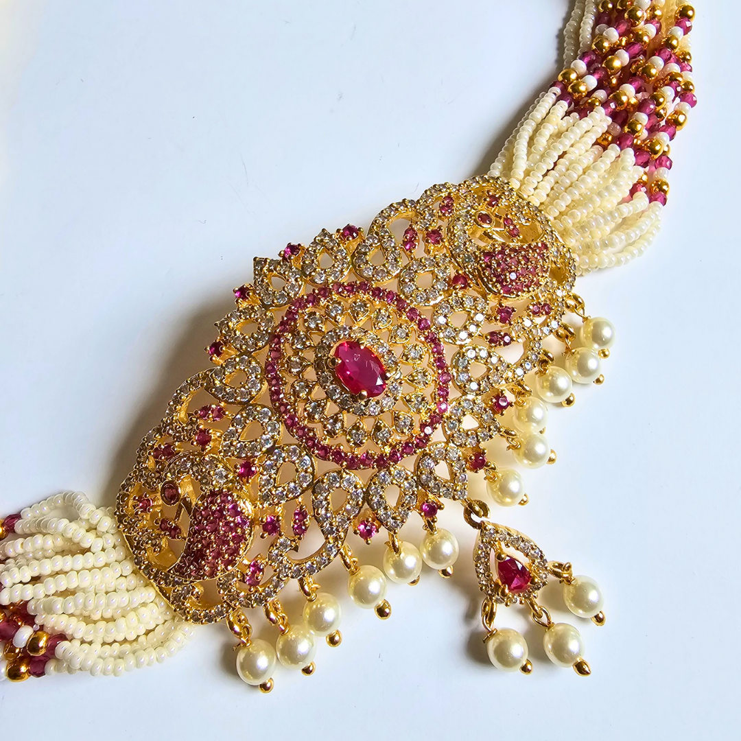 Make a graceful statement with this exquisite pearl and gold choker necklace set, adorned with a stunning pink stone centerpiece pendant. Designed to sit elegantly along the neckline, this choker radiates royal charm while staying delicately feminine.
