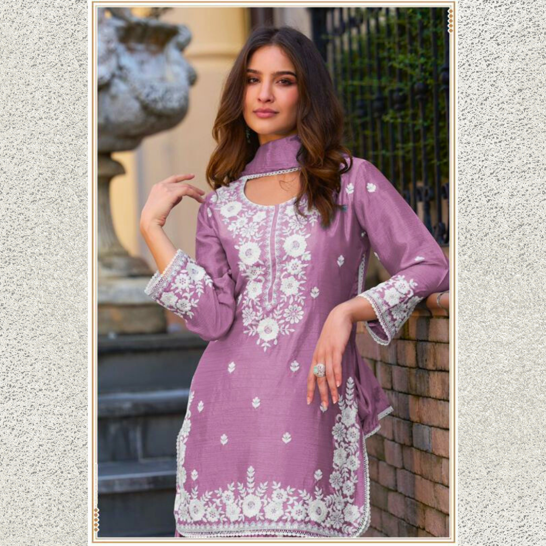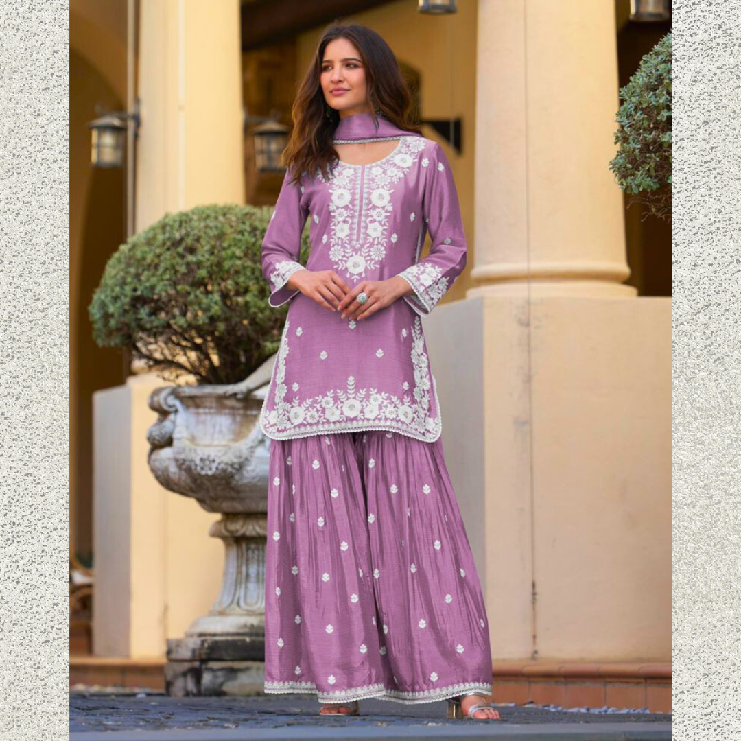 Step into timeless grace with our Purple Chinon Sharara Set, beautifully adorned with intricate white embroidery that enhances its elegance. Crafted from premium Chinon fabric, known for its soft texture and fluid drape, this three-piece suit set includes a finely embroidered kurti, wide-leg sharara pants, and a matching dupatta, creating a stunning silhouette.