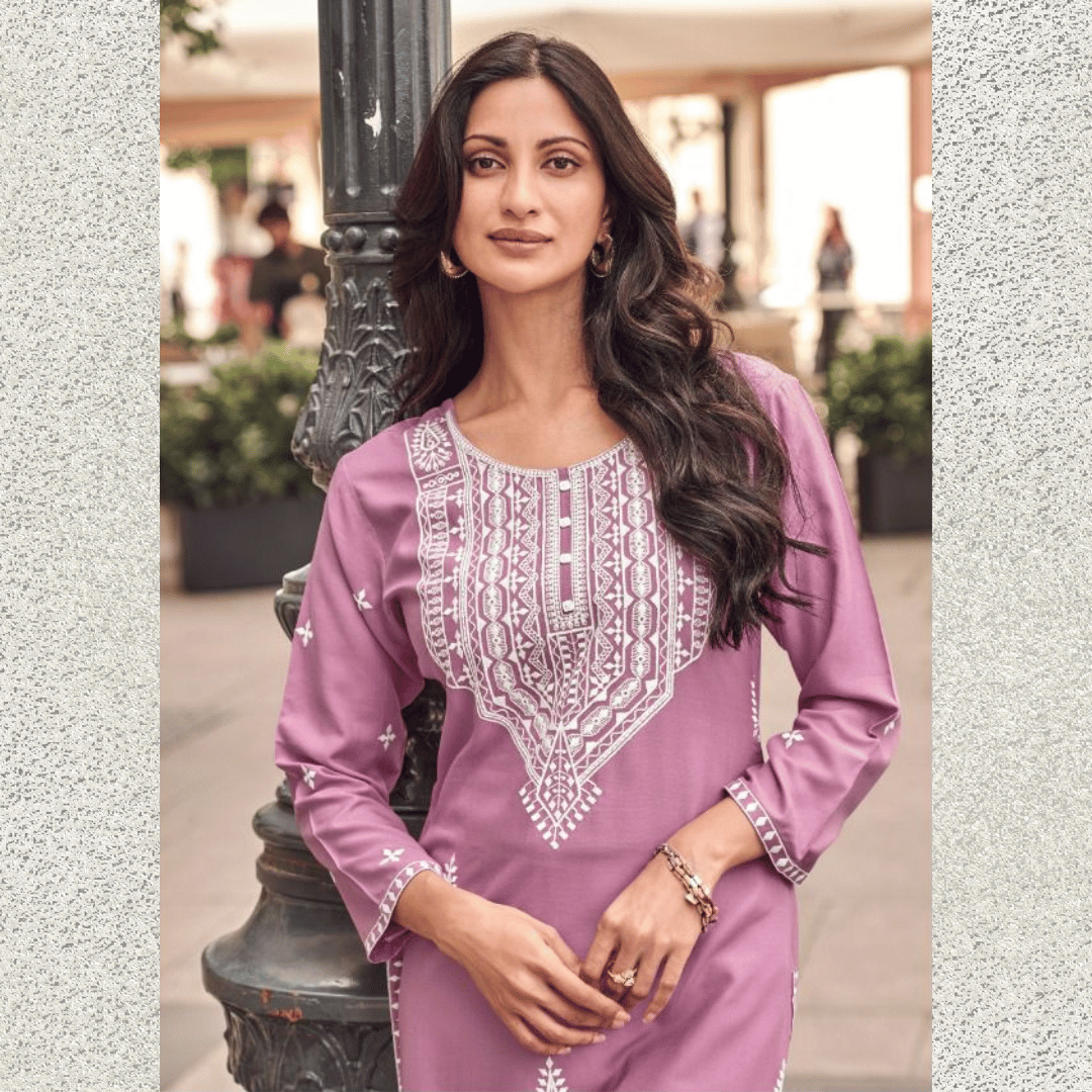 Elegant rayon viscose Lakhnawi embroidered kurti set with matching viscose rayon bottom, perfect for festive and everyday ethnic wear.