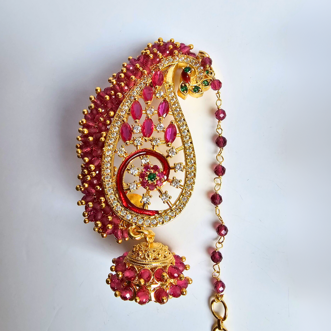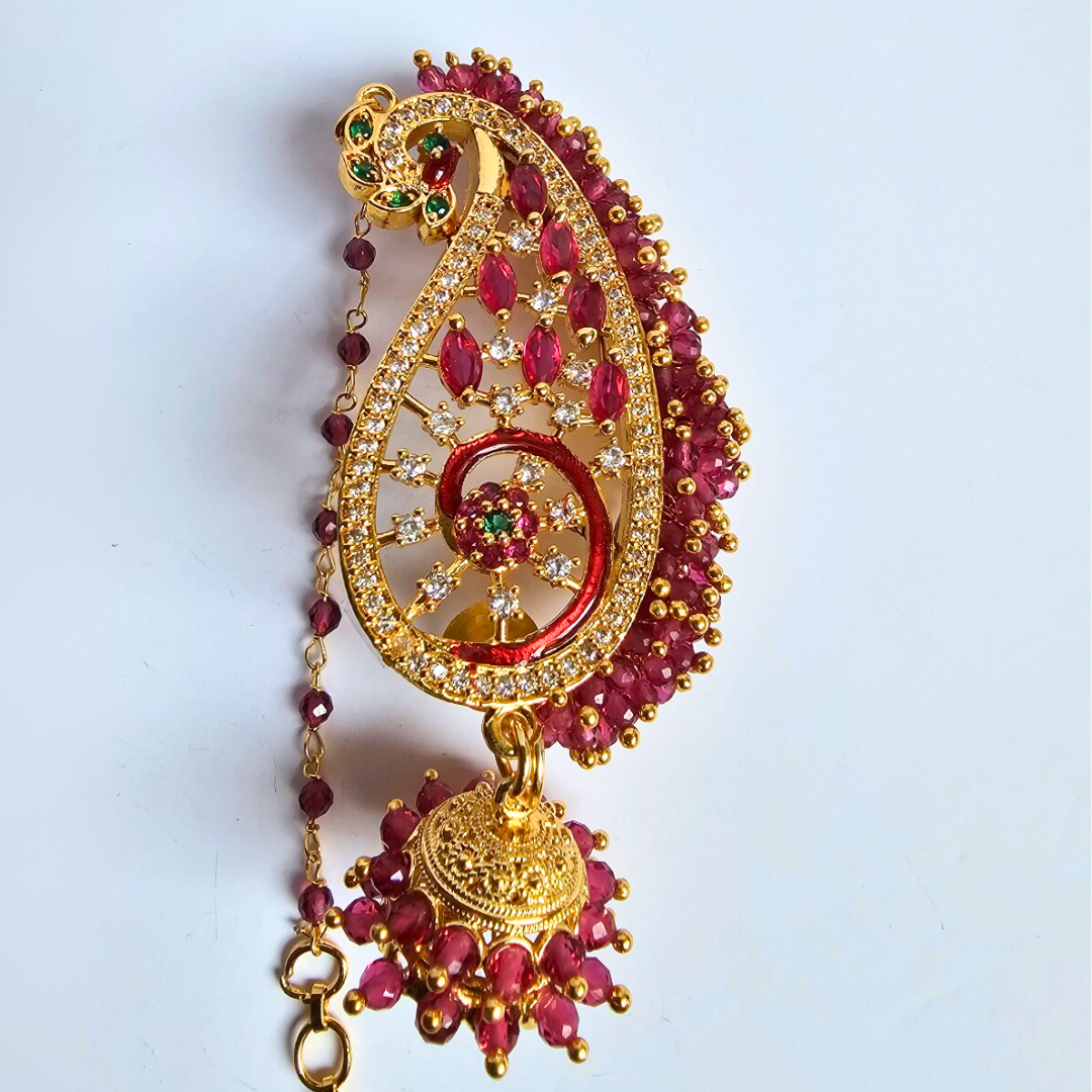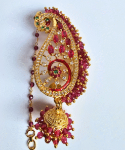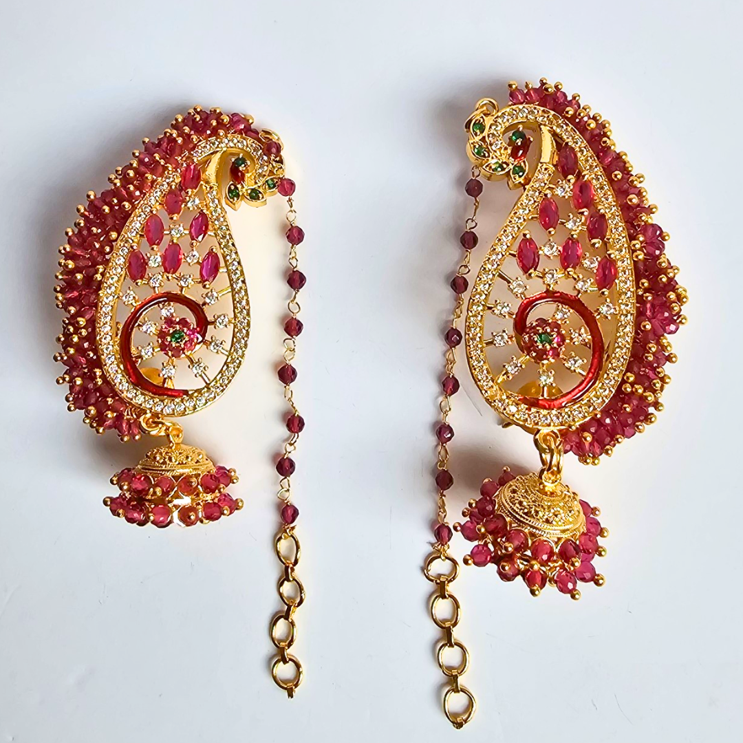 Elevate your ethnic ensemble with this stunning red stone earcuff jhumka, featuring a graceful leaf-inspired design in a rich gold finish. It has matching red stone chain that connects the earcuff to the jhumka, adding a touch of sophistication and movement to your look.