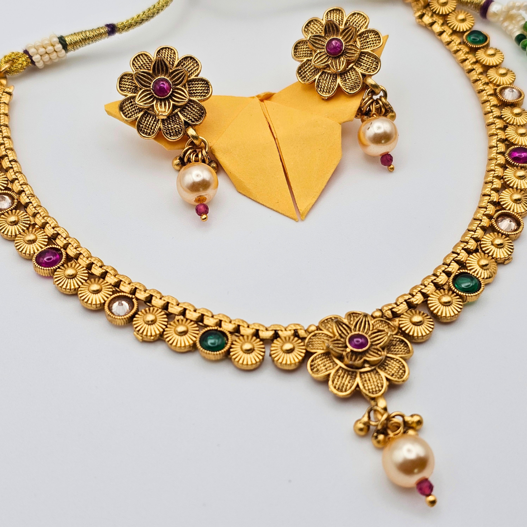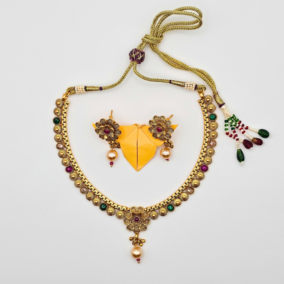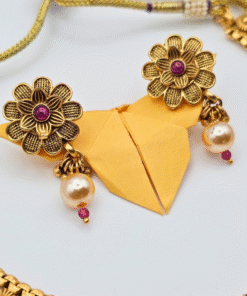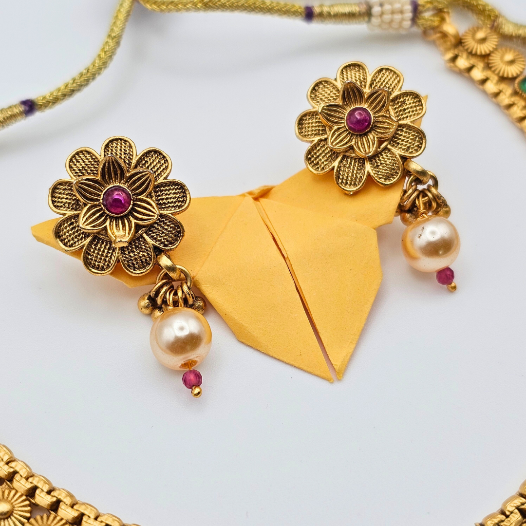 Embrace timeless Indian craftsmanship with this Antique Finish Gold Plated Traditional Necklace and Earring Set, beautifully designed to elevate your festive and wedding looks. The intricate floral motifs are adorned with rich Kempu stones—known for their deep red and green hues—paired with elegant pearls that add a classic touch of royalty.