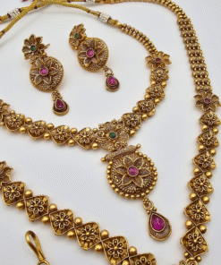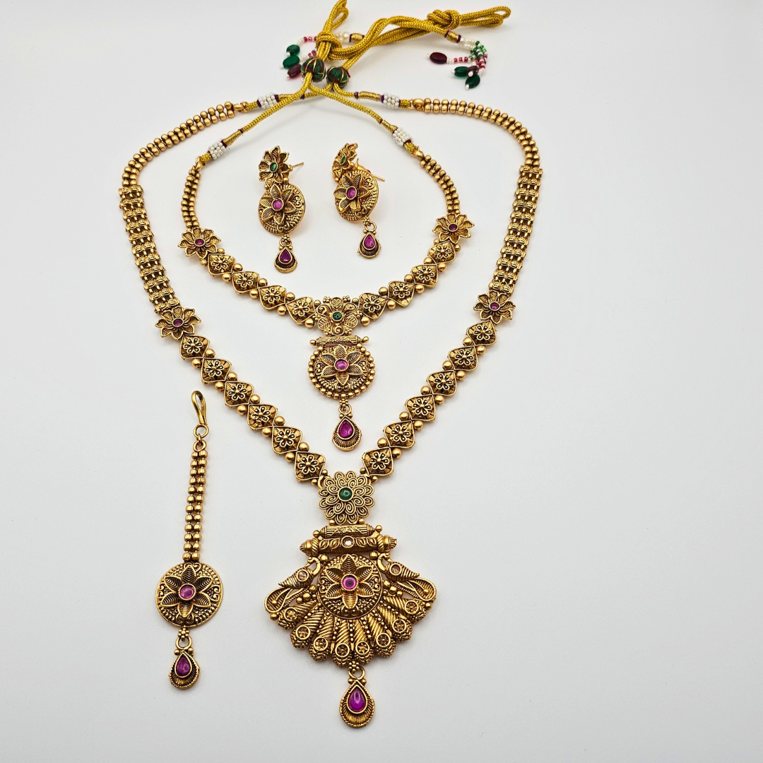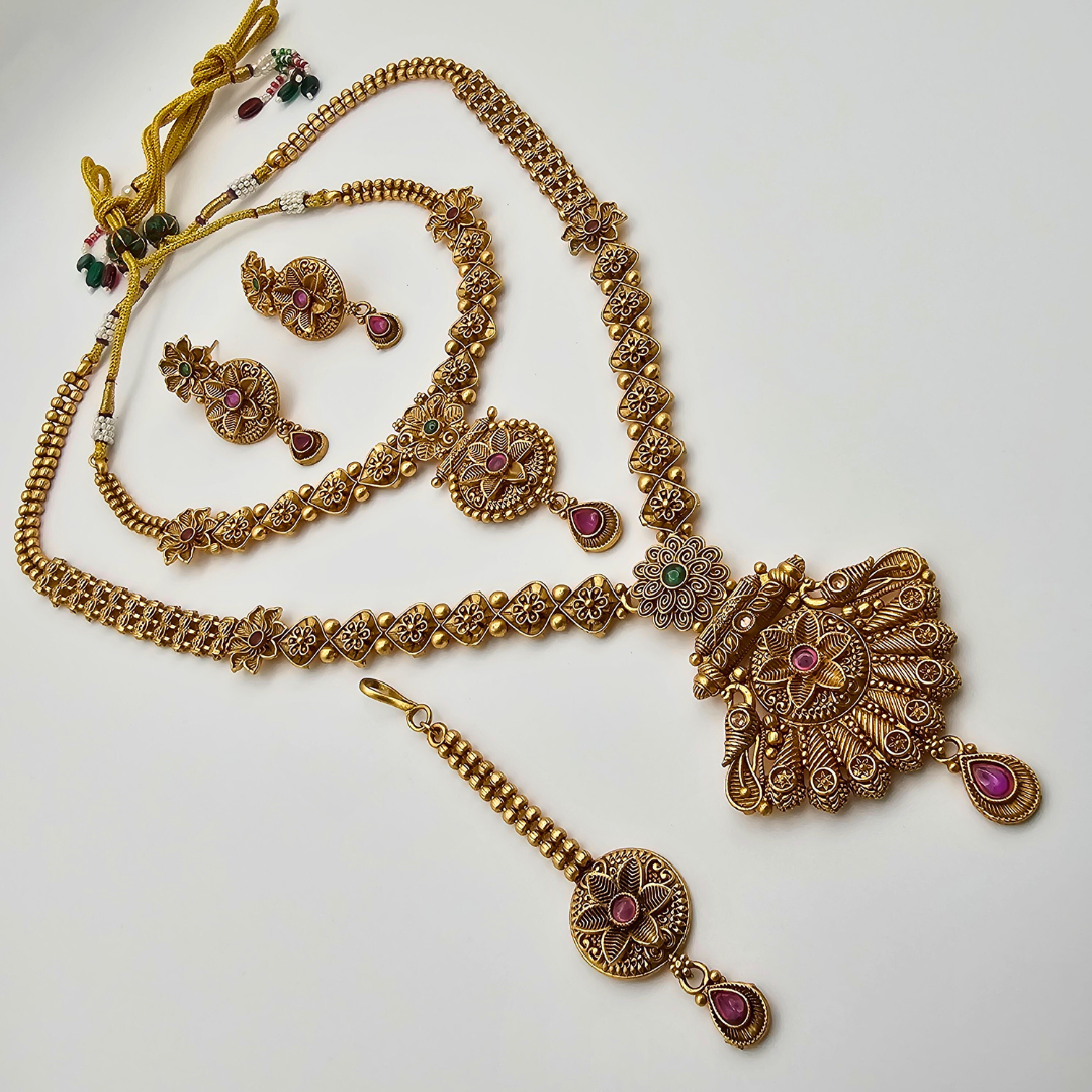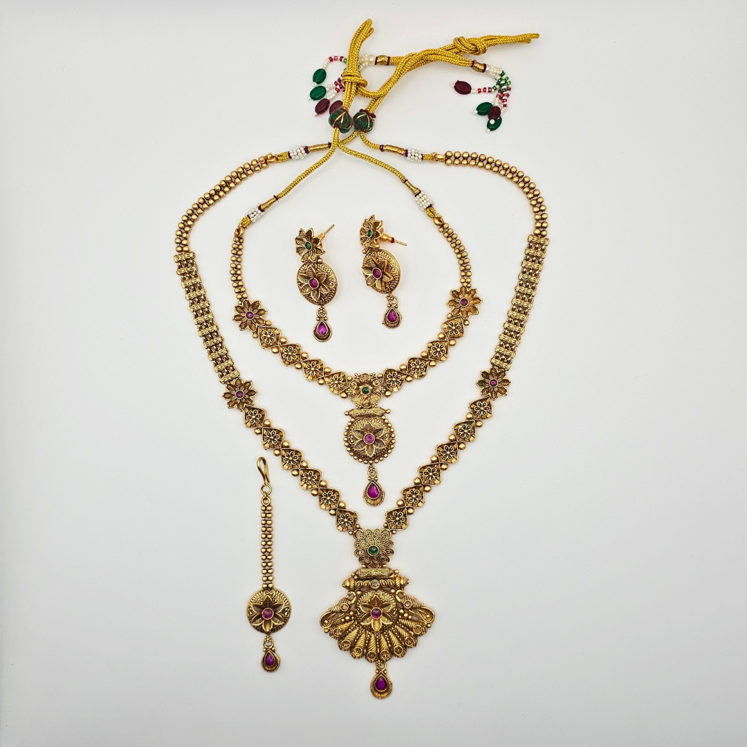 Embrace timeless elegance with our Regal Gold-Plated Rajwadi Antique Necklace Set, a stunning three-piece ensemble featuring a beautifully handcrafted Kundan necklace, matching earrings, and an exquisite mathapatti. Designed to elevate your ethnic look, this set blends royal charm with intricate craftsmanship, making it the perfect accessory for weddings, cultural events, festive celebrations, or bridal wear.
