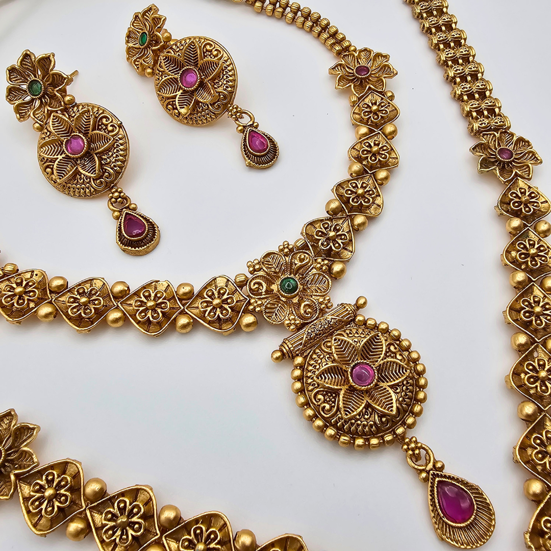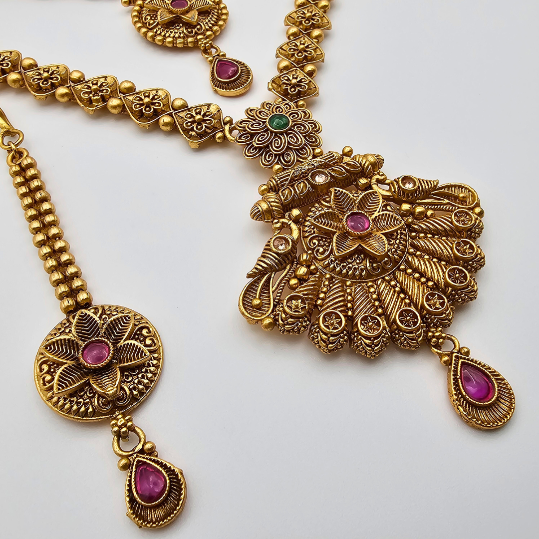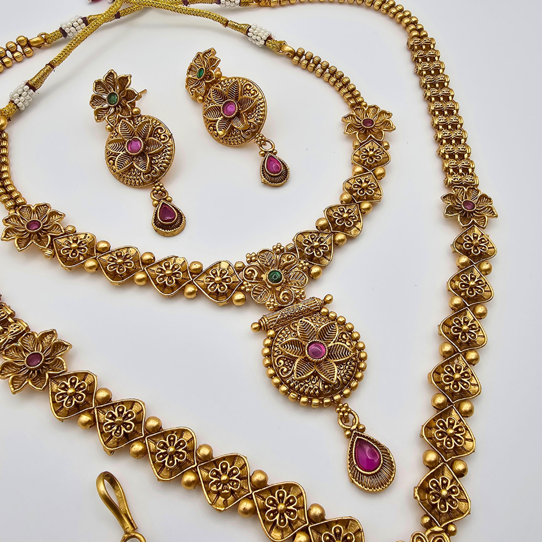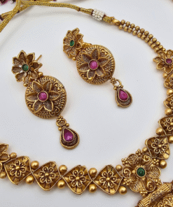 Embrace timeless elegance with our Regal Gold-Plated Rajwadi Antique Necklace Set, a stunning three-piece ensemble featuring a beautifully handcrafted Kundan necklace, matching earrings, and an exquisite mathapatti. Designed to elevate your ethnic look, this set blends royal charm with intricate craftsmanship, making it the perfect accessory for weddings, cultural events, festive celebrations, or bridal wear.