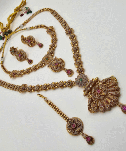 The necklace features premium-quality stones set in a rich gold-plated finish, offering a luxurious sparkle and heritage appeal. The matching earrings complement the design flawlessly, while the mathapatti adds a touch of regal beauty—creating a complete, coordinated look that stands out.