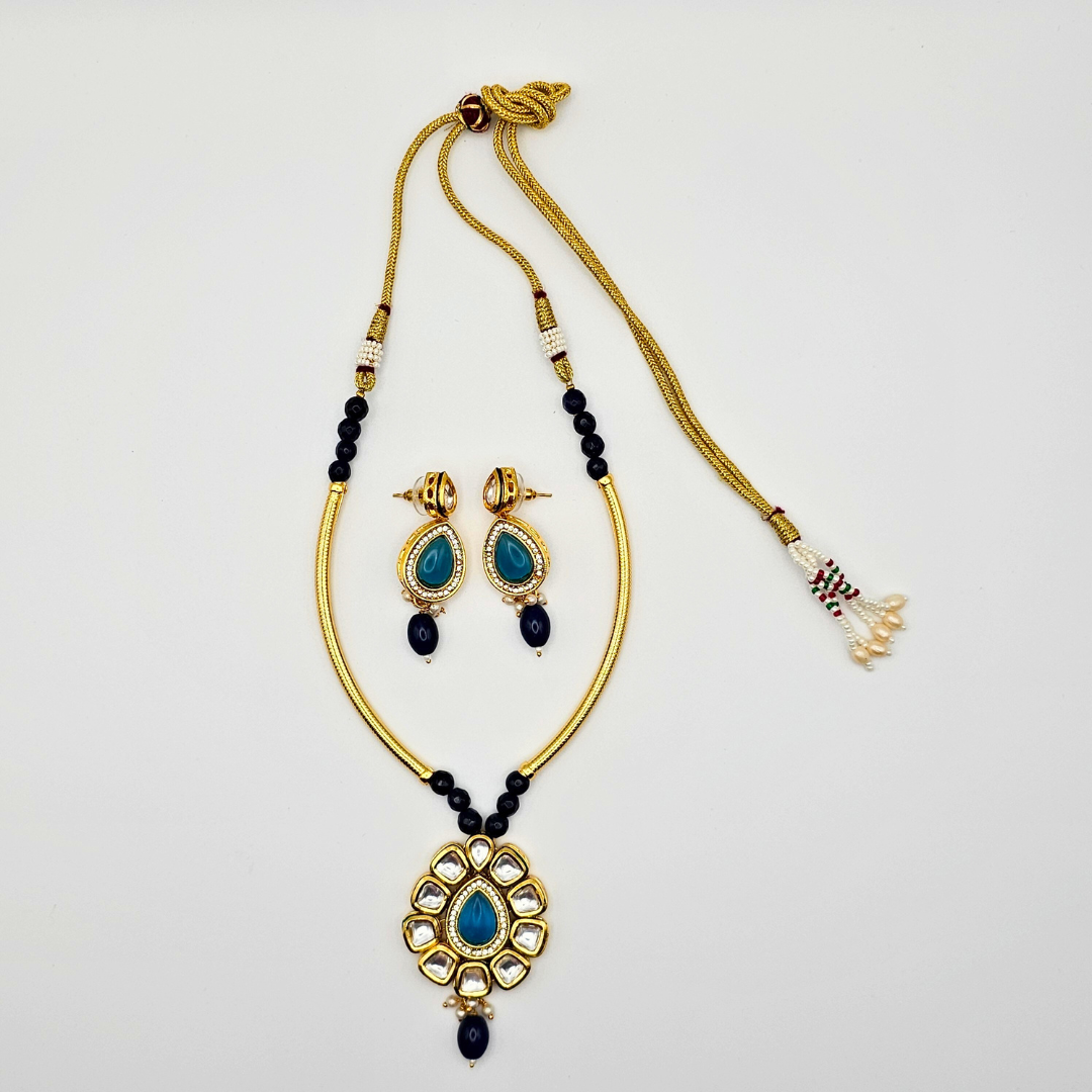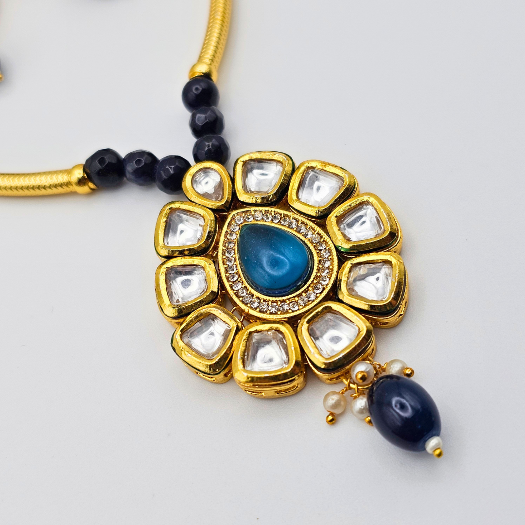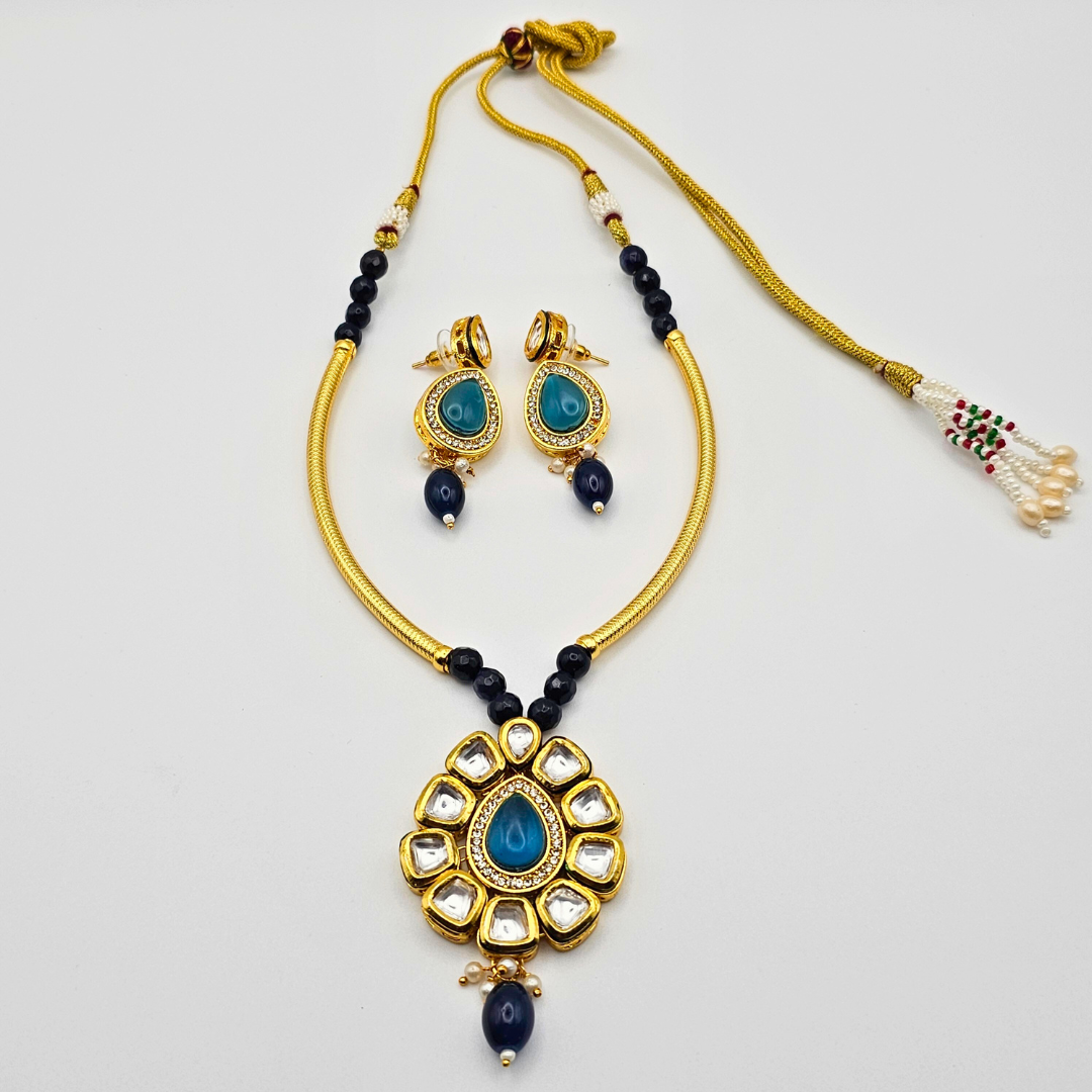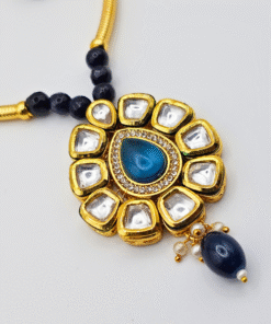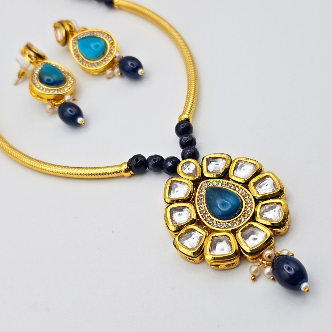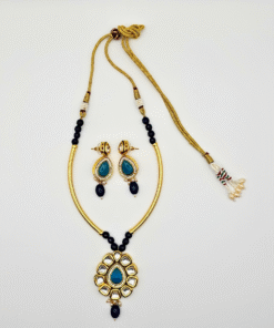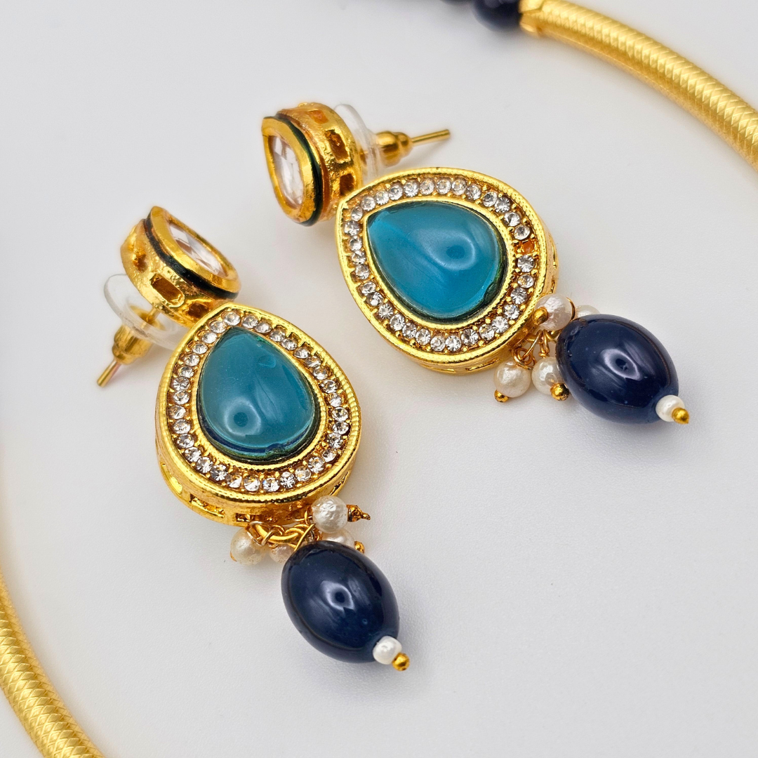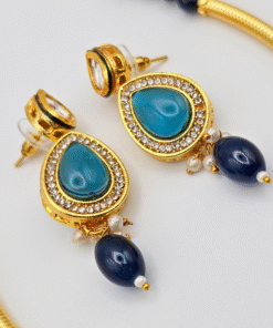 The delicate blue accents bring a vibrant pop of color, making the set perfect for weddings, festive occasions, parties, engagements, and cultural events. The matching earrings complete the look, offering a beautifully coordinated finish. Designed to complement sarees, lehengas, gowns, and Indo-western outfits, this timeless set is a must-have for every jewelry lover.