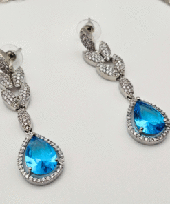 A stunning American Diamond necklace set featuring a blue teardrop stone with matching earrings. Elegant, sparkling, and perfect for weddings, parties, and gifting.