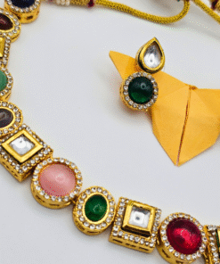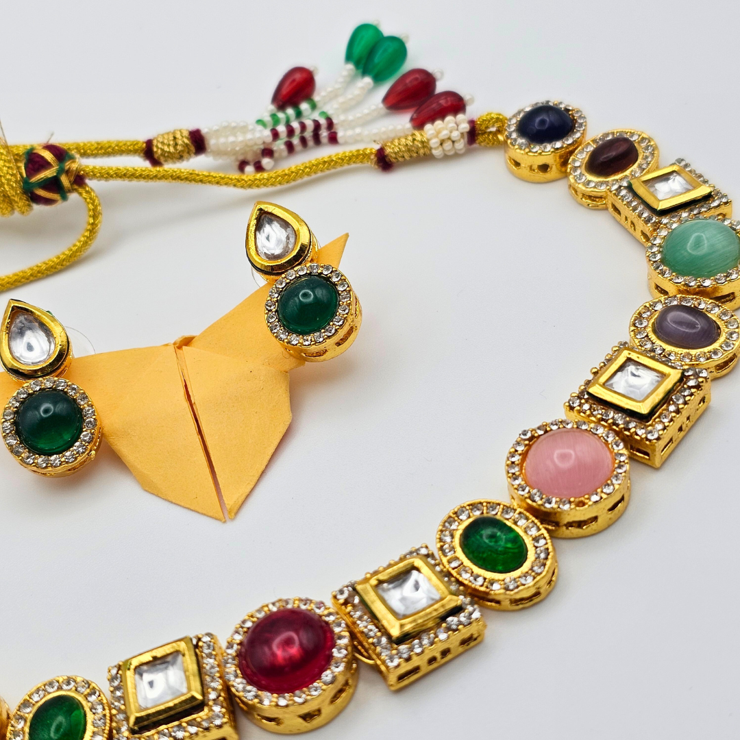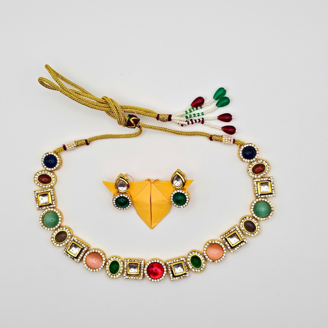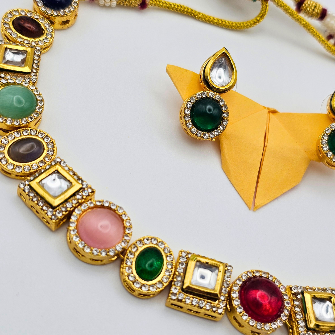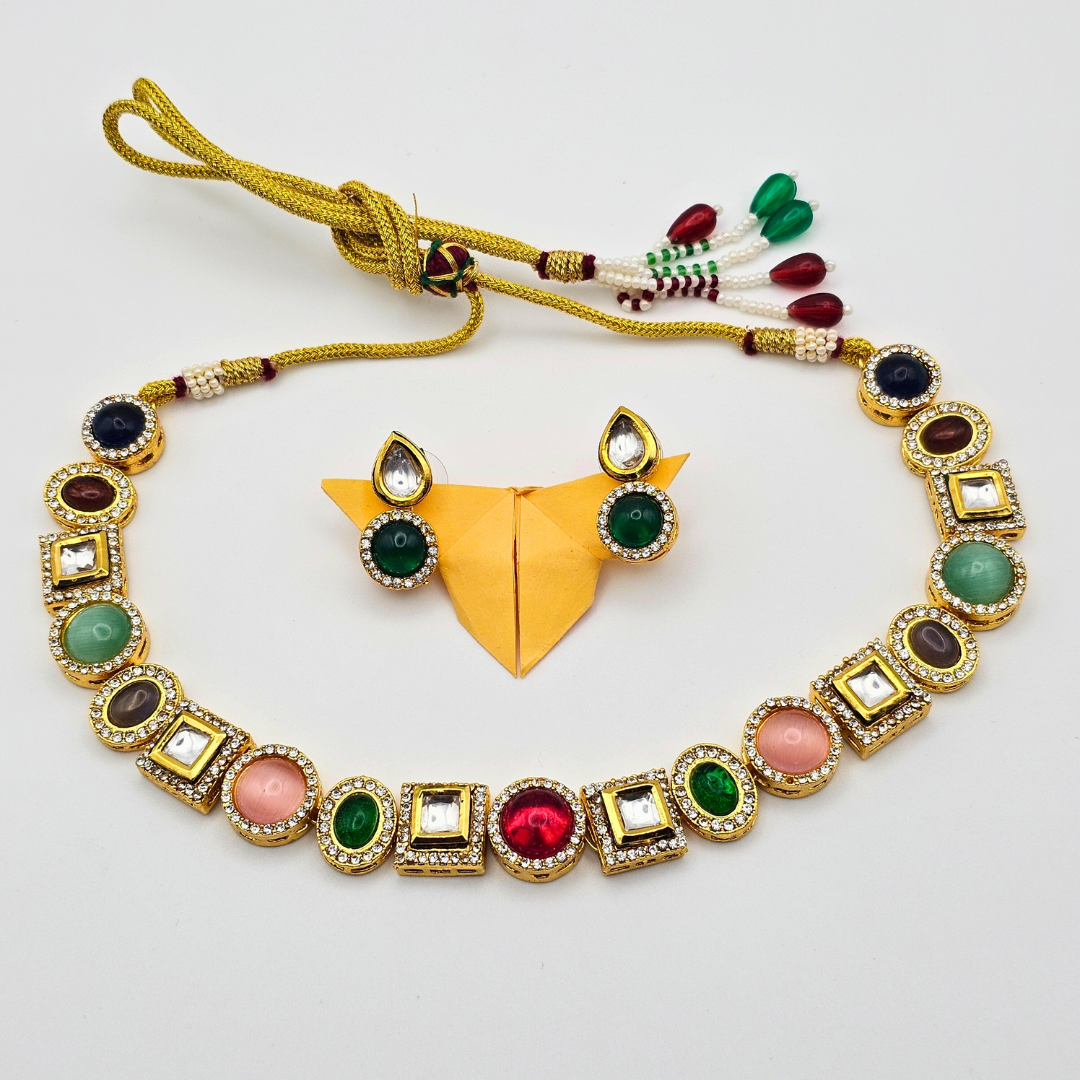 Elegant gold plated kundan choker necklace set with vibrant multicolored stones and matching earrings. Ideal for weddings, parties, and festive occasions.