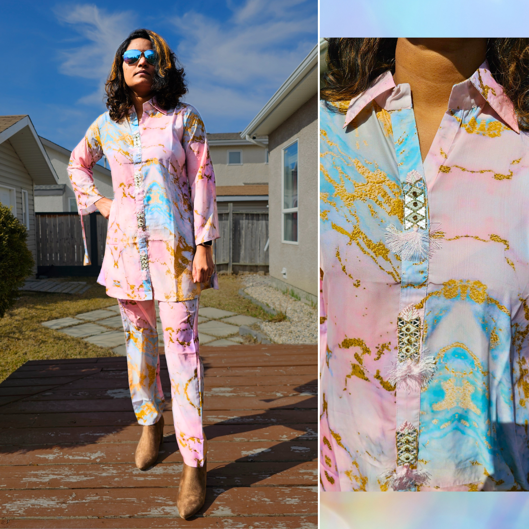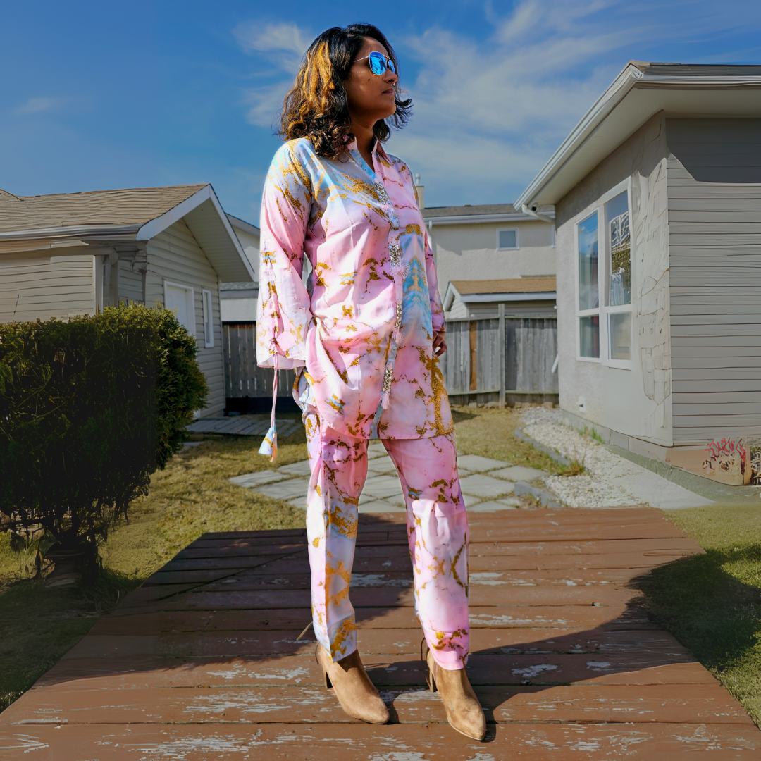 Step into effortless style and comfort with our Soft Pink Co-ord Set, designed to keep you looking smart and feeling relaxed all day long. Crafted from ultra-soft, breathable fabric, this set includes a sleek top and matching smart pants with pockets – perfect for casual outings, work-from-home days, or brunch with friends. The gentle pink hue adds a touch of elegance, while the tailored fit offers a modern, polished silhouette.