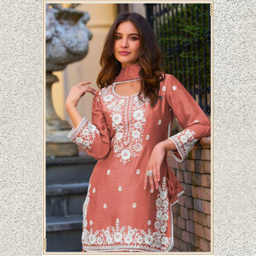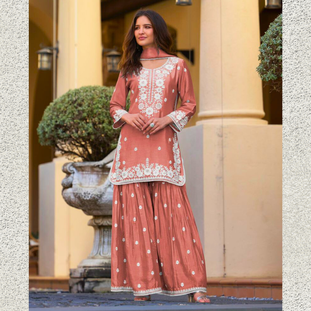 Step into timeless grace with our Warm Orange Chinon Sharara Set, beautifully adorned with intricate white embroidery that enhances its elegance. Crafted from premium Chinon fabric, known for its soft texture and fluid drape, this three-piece suit set includes a finely embroidered kurti, wide-leg sharara pants, and a matching dupatta, creating a stunning silhouette.