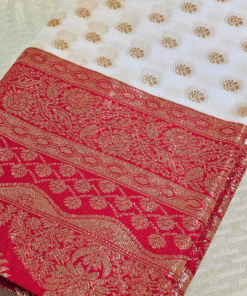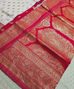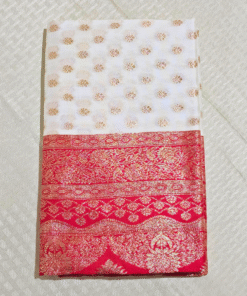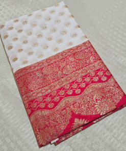 Radiate elegance with this white Pattu silk saree featuring a stunning golden-red border — perfect for festive occasions, weddings, and cultural celebrations.