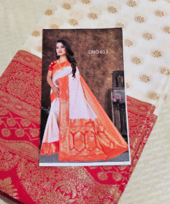 Radiate elegance with this white Pattu silk saree featuring a stunning golden-red border — perfect for festive occasions, weddings, and cultural celebrations.