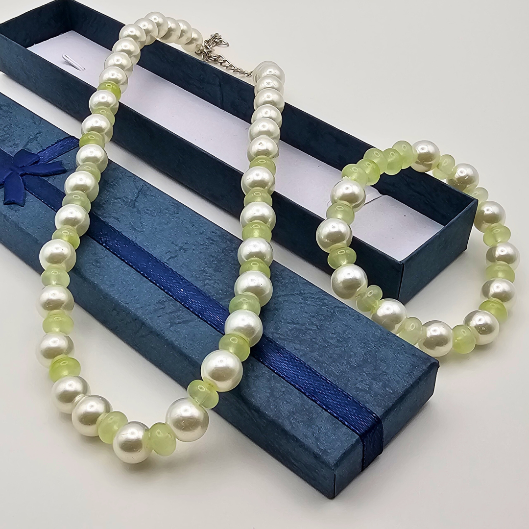 Elevate your look with this timeless white pearl necklace accented by delicate lime beads, bringing a touch of feminine charm to a classic favorite. Measuring approximately 20 cm in length, the necklace is made with high-gloss fashion pearls that shimmer with sophistication and grace.