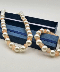 White Pearl & Orange Bead Necklace Set – Elegant Gloss Finish with Matching Bracelet